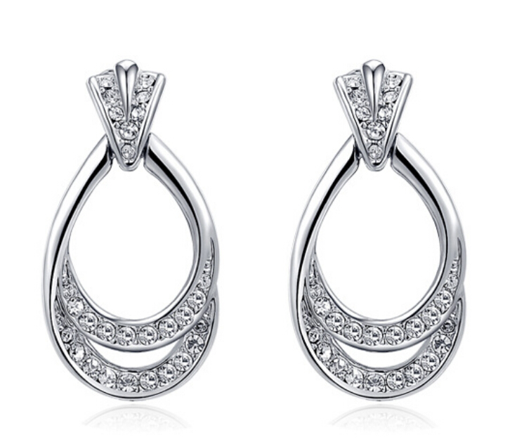 Hermosos aretes en baño de oro blanco de 18 quilates, fino diseño de gotas, con incrustación de cristales en color blanco.