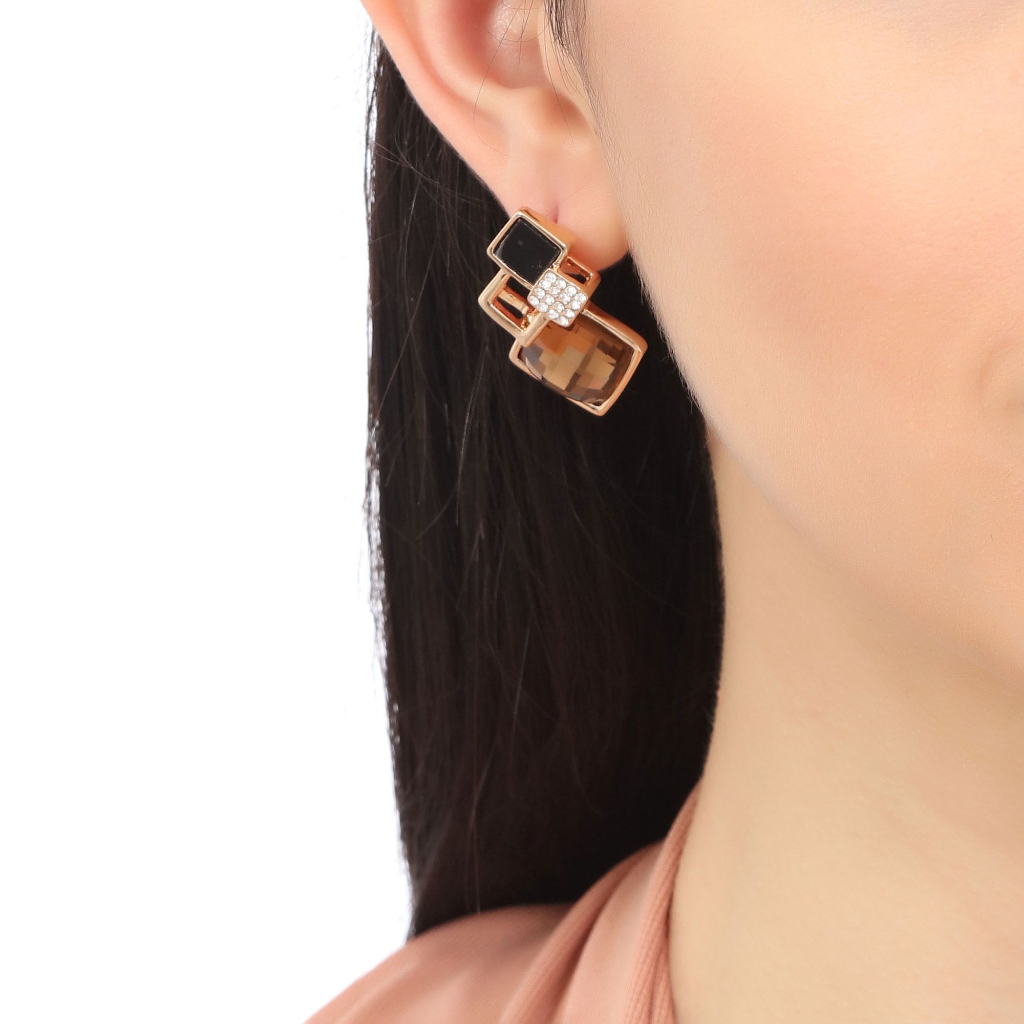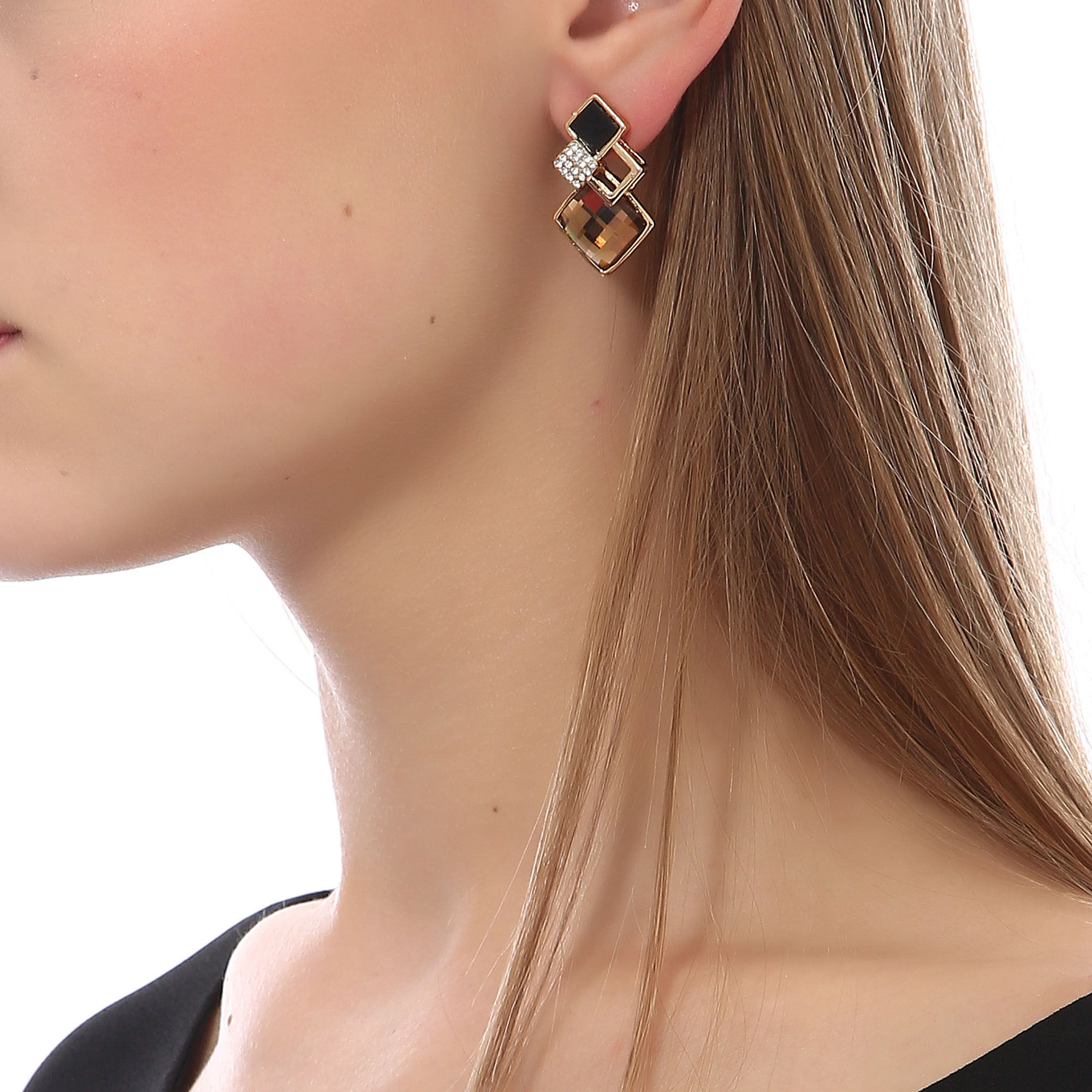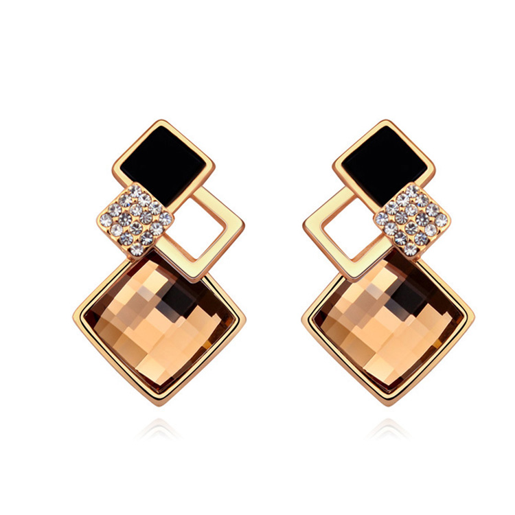 Aretes en baño de oro amarillo de 18 quilates, fino diseño de rombos, con cristal ámbar corte losange, esmaltado color negro e incrustación de cristales blancos.