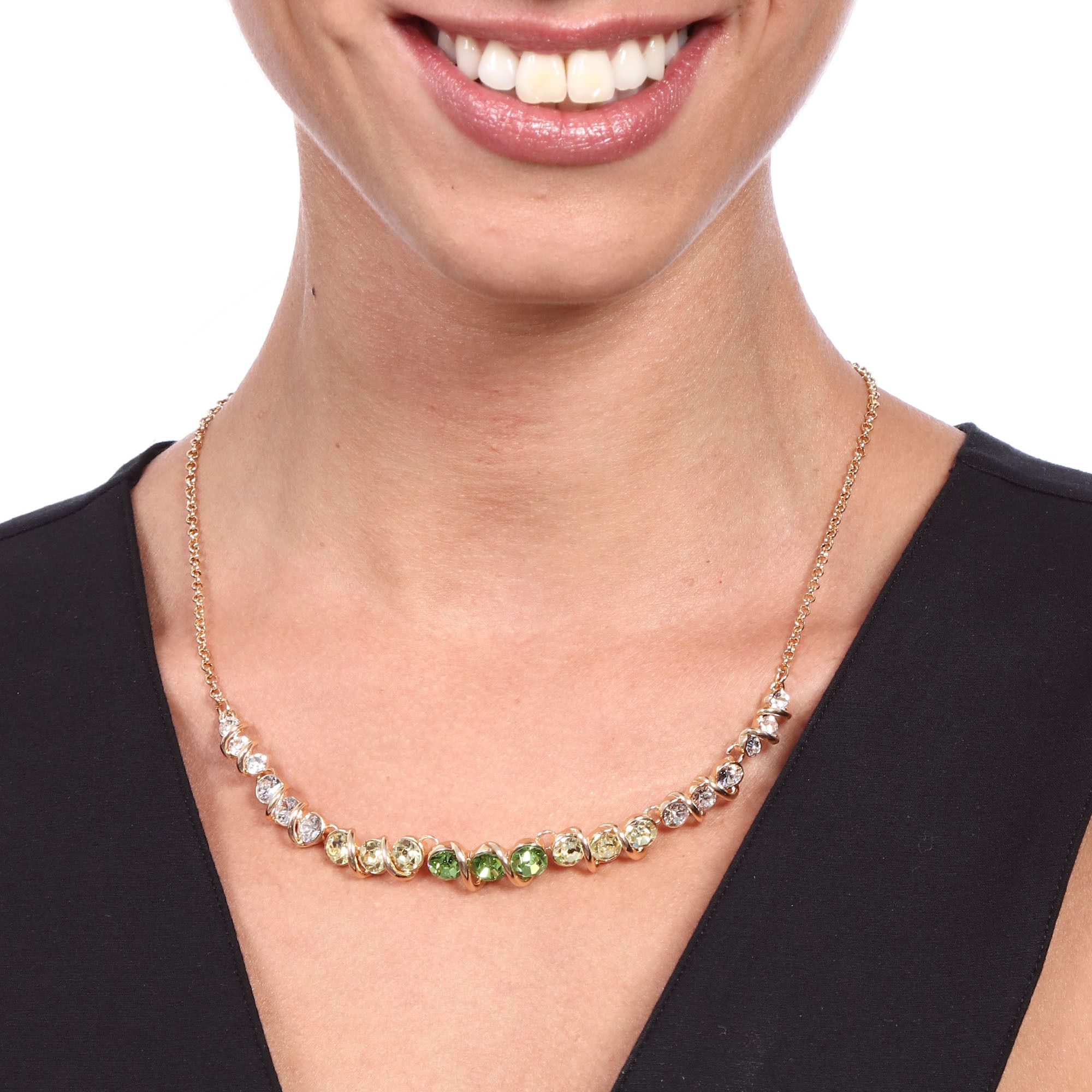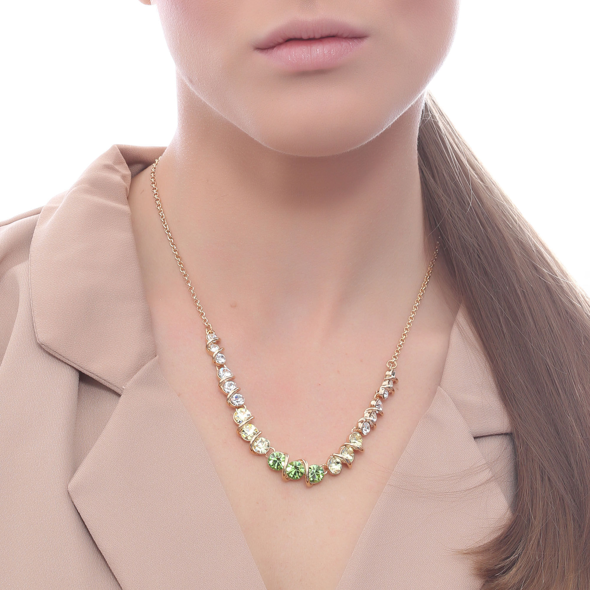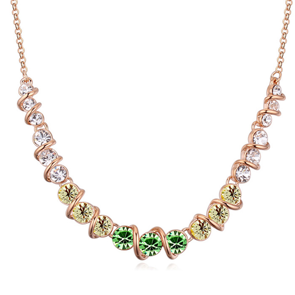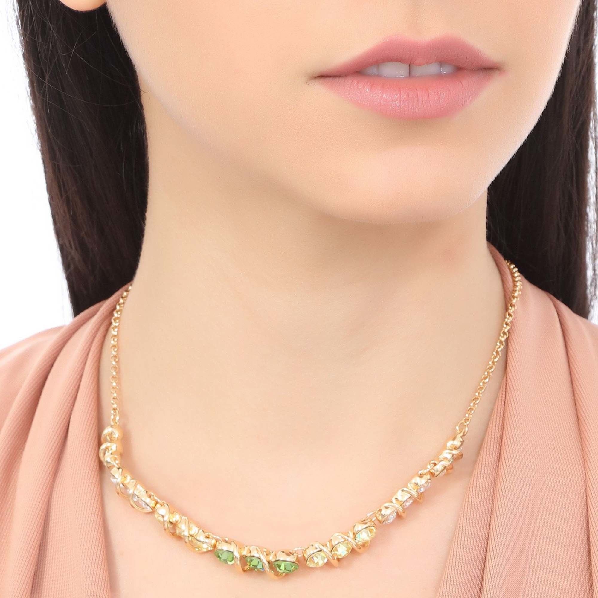 Hermoso Collar en baño de oro amarillo de 18 quilates, fino diseño de espiral con incrustación de cristales en color blanco y verde. Fabricado en una estructura de aleación de platino con rodio sin níquel 1. joyería Hipoalergénica. 2. Incluye cajita de joyería. 3. Garantía de 30 días por defectos de fabrica.
