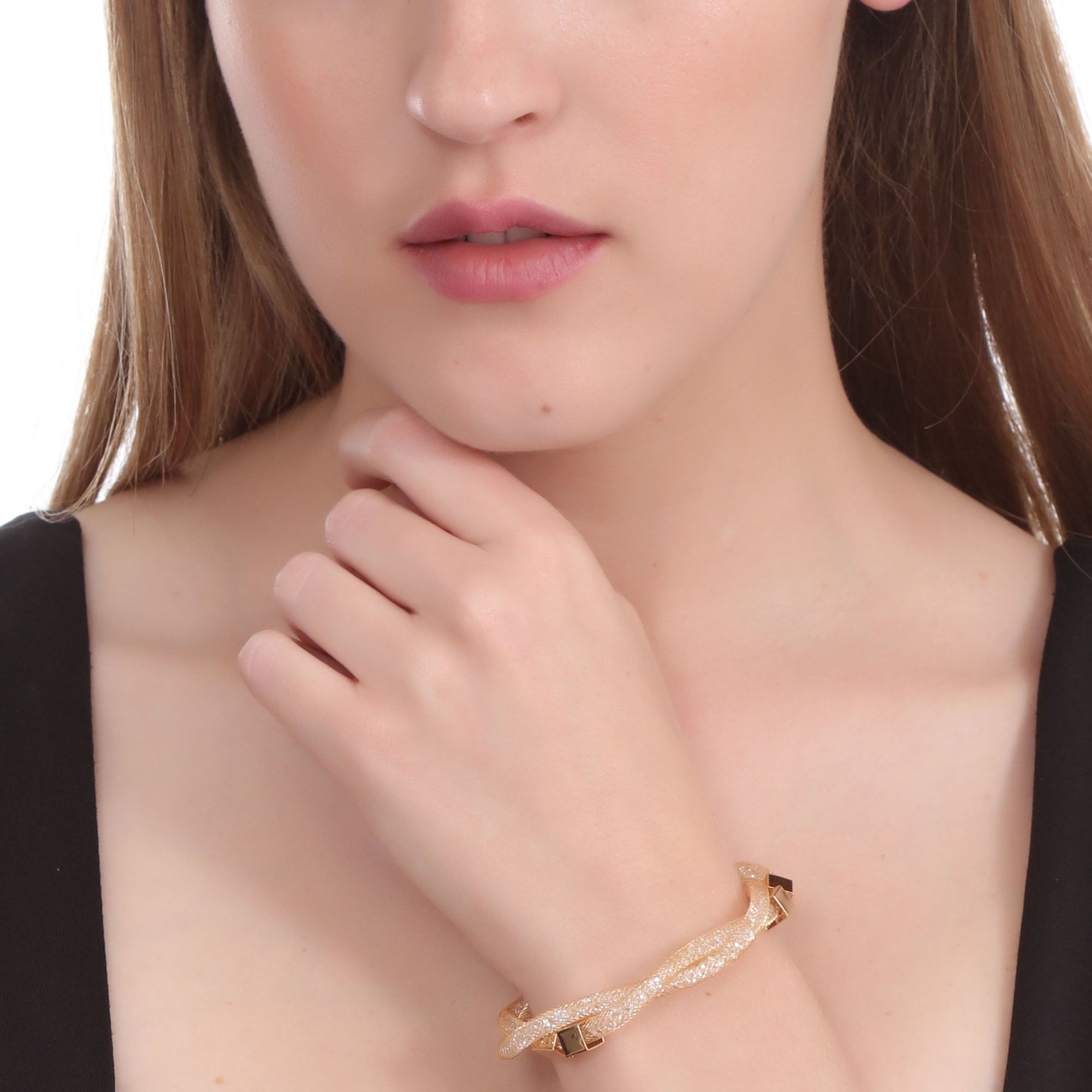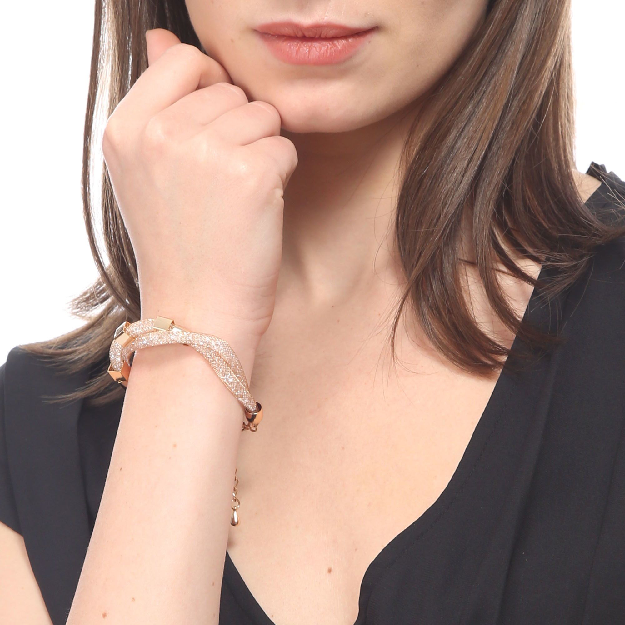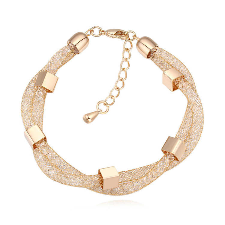 Pulsera con detalles de baño de oro amarillo de 18 quilates y malla en color dorado, con cristales en color blanco dentro.