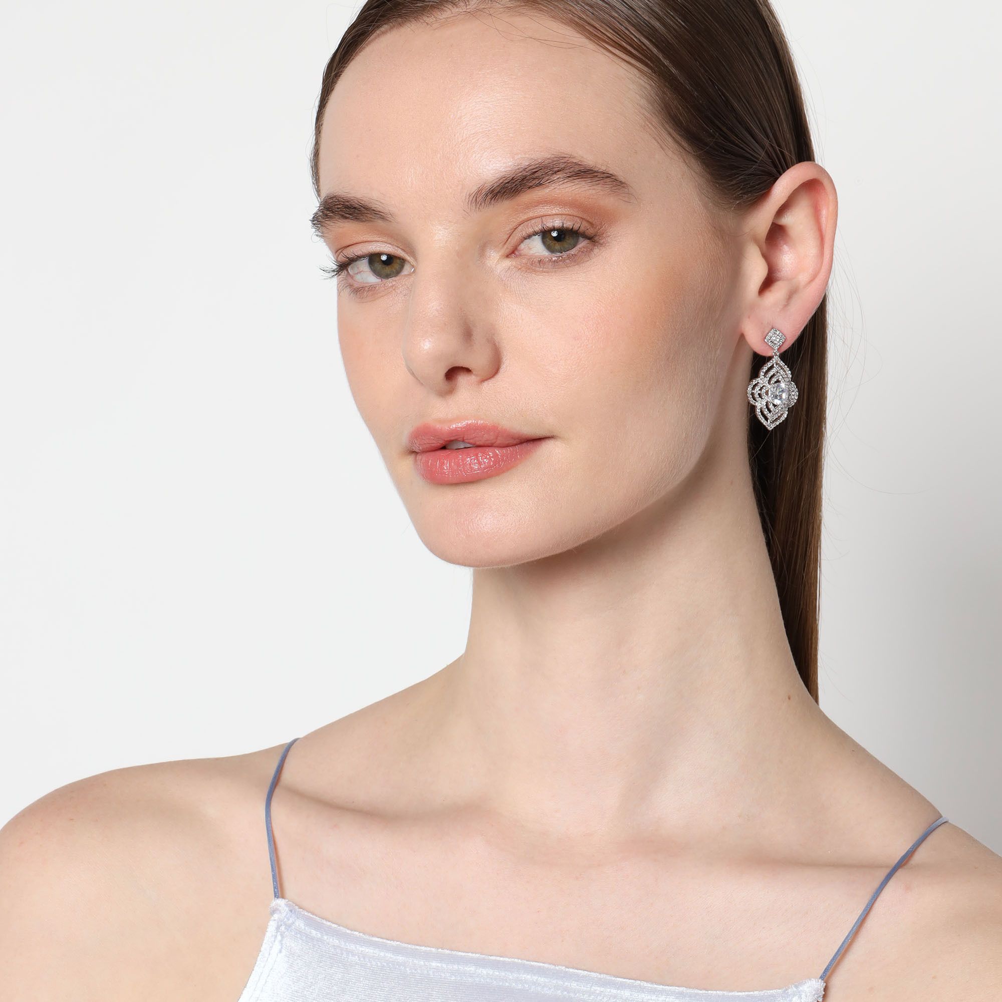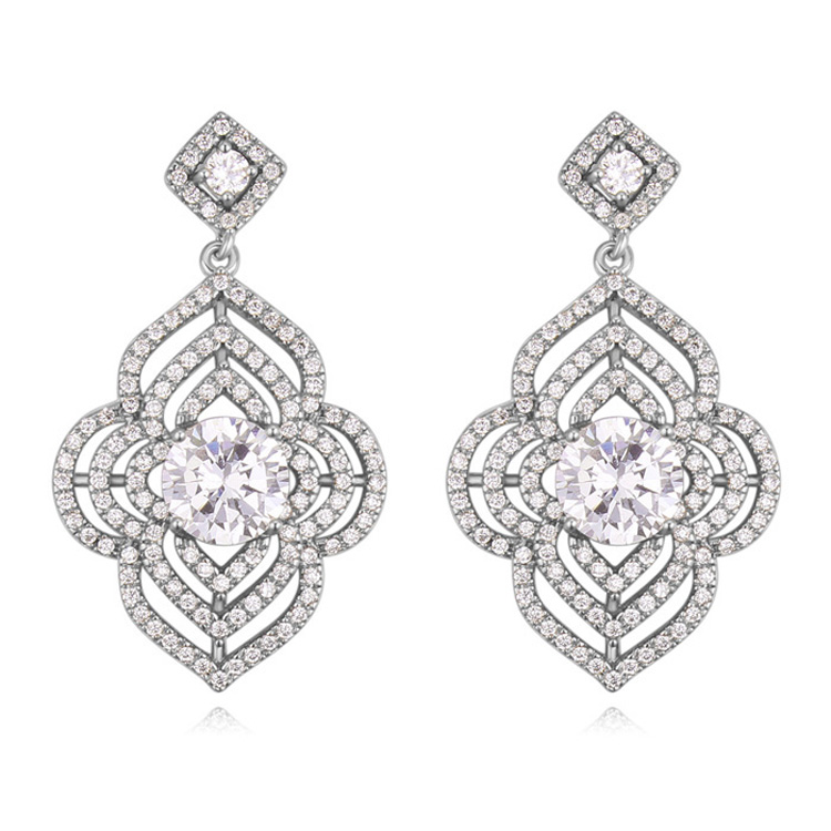 Elegantes aretes en baño de oro blanco de 18 quilates, exquisito diseño de flor, con cristal blanco corte brillante e incrustación de cristales blancos.