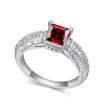 Anillo en baño de oro blanco de 18 quilates, elegante diseño, con cristal rojo corte princesa e incrustaciones de cristales blancos.