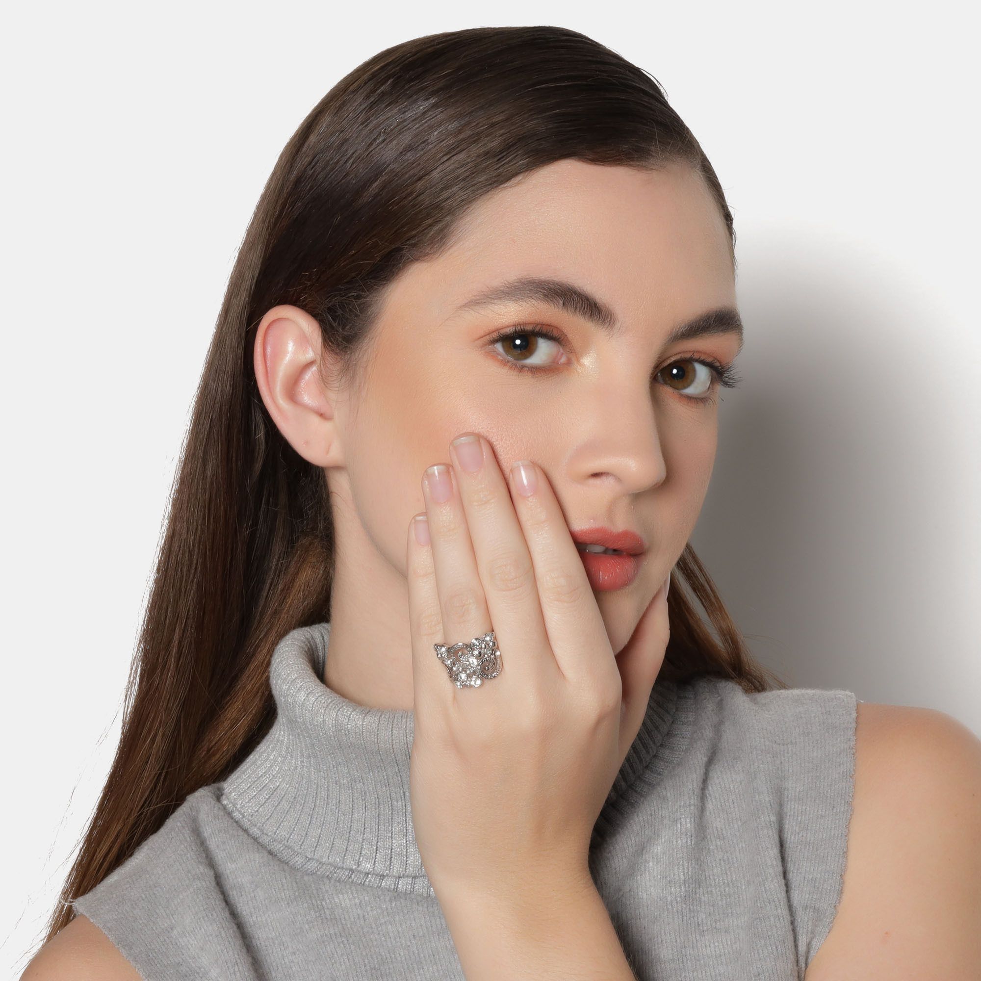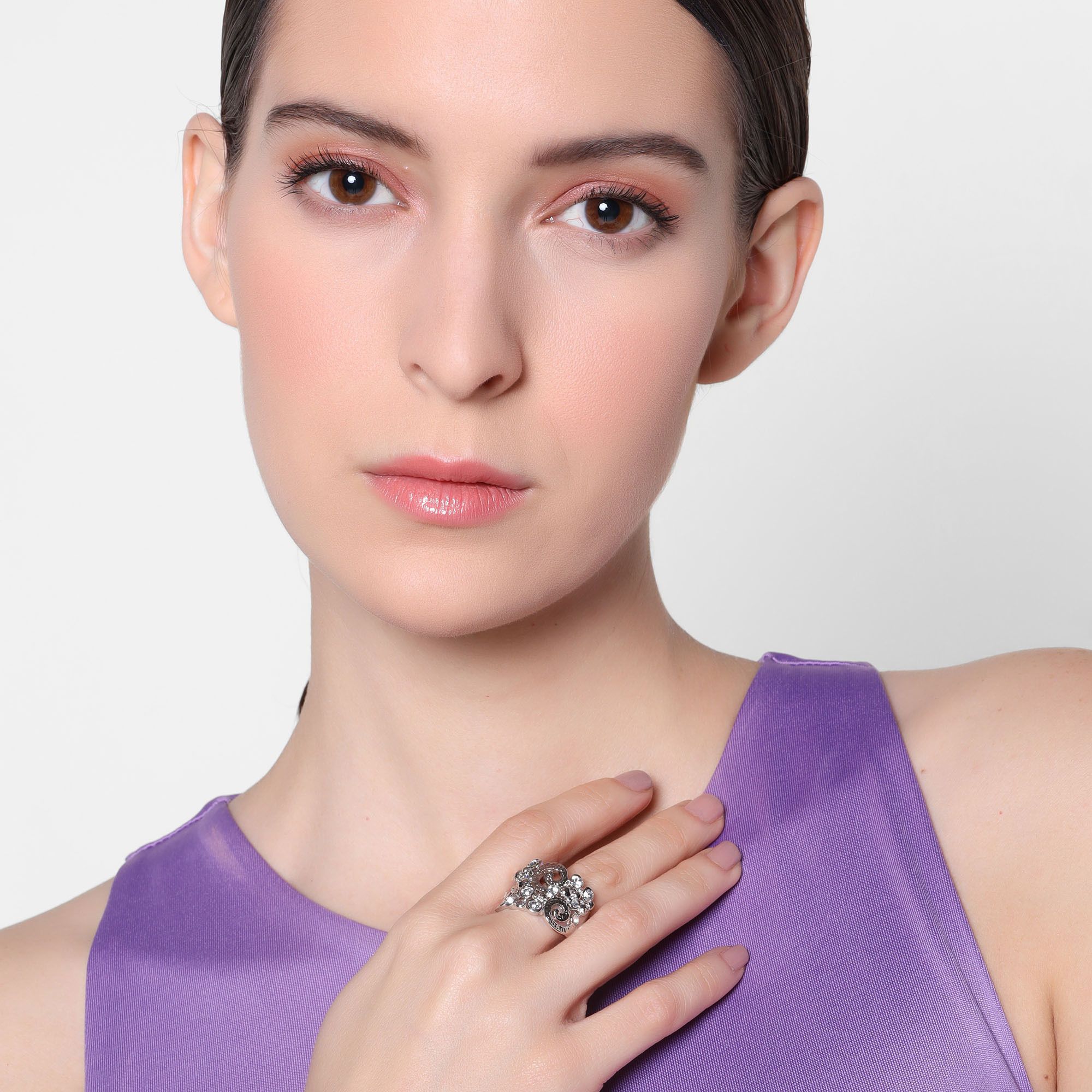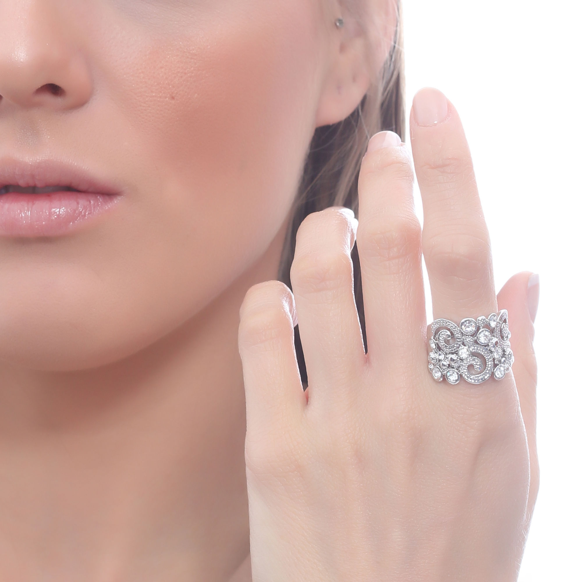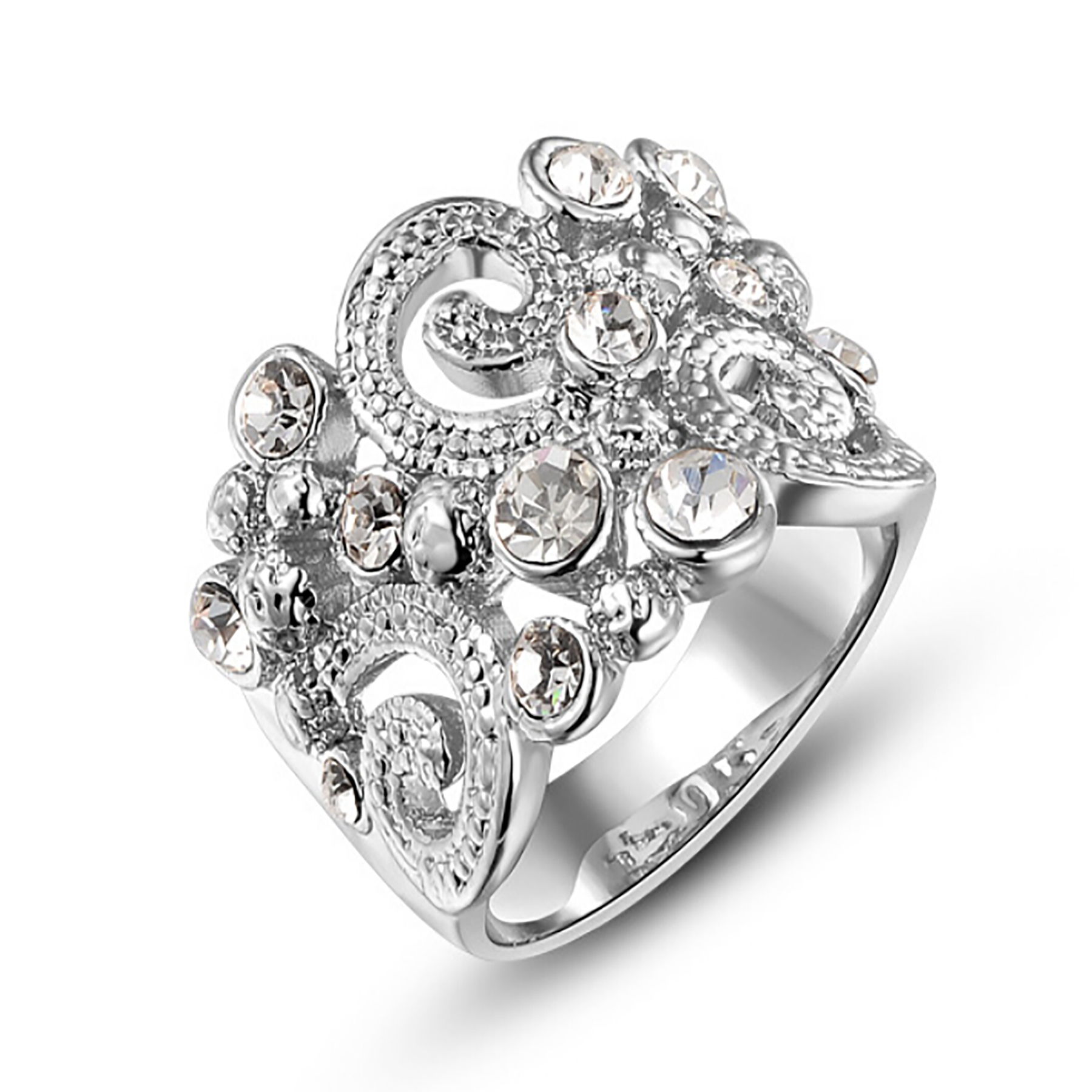 Precioso anillo en baño de oro blanco de 18 quilates, diseño de espirales, con incrustaciones de cristales blancos.