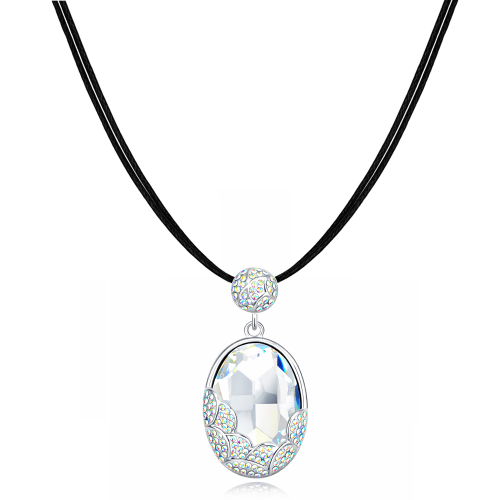 Lindo Collar en baño de oro blanco de 18 quilates, diseño de ovalo con incrustación de cristales en color blanco y tornasol. Fabricado en una estructura de aleación de platino con rodio sin níquel 1. joyería Hipoalergénica. 2. Incluye cajita de joyería. 3. Garantía de 30 días por defectos de fabrica.