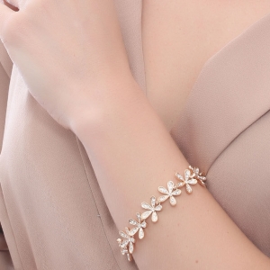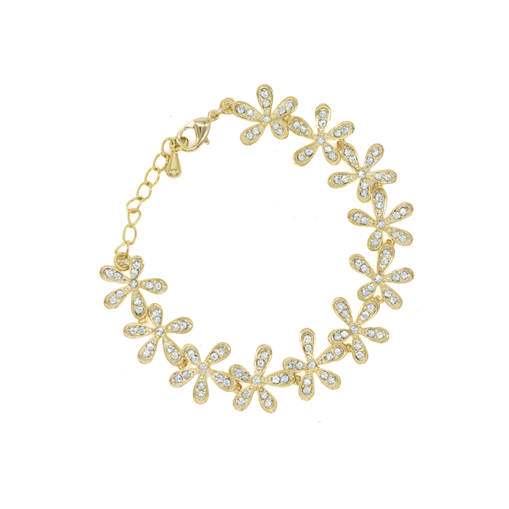 Lindo brazalete en baño de oro amarillo de 18 quilates, elegante diseño de flores, con incrustaciones de cristales en color blanco.