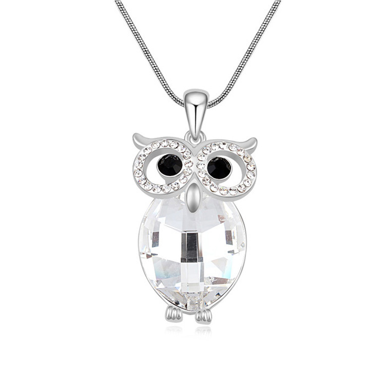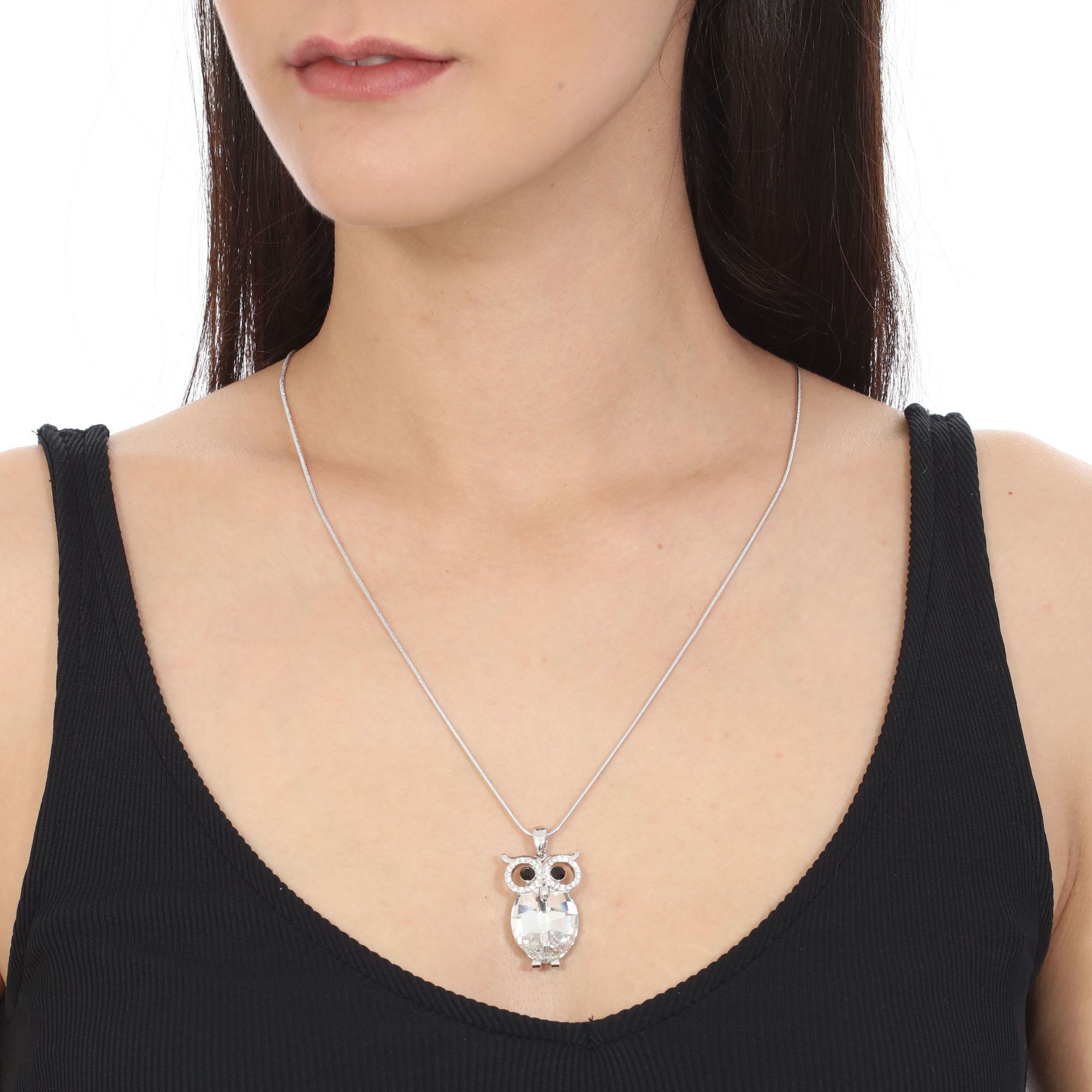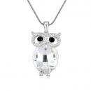 Lindo Collar en baño de oro blanco de 18 quilates, diseño de búho con incrustacines de cristales tonos negro y blanco.