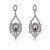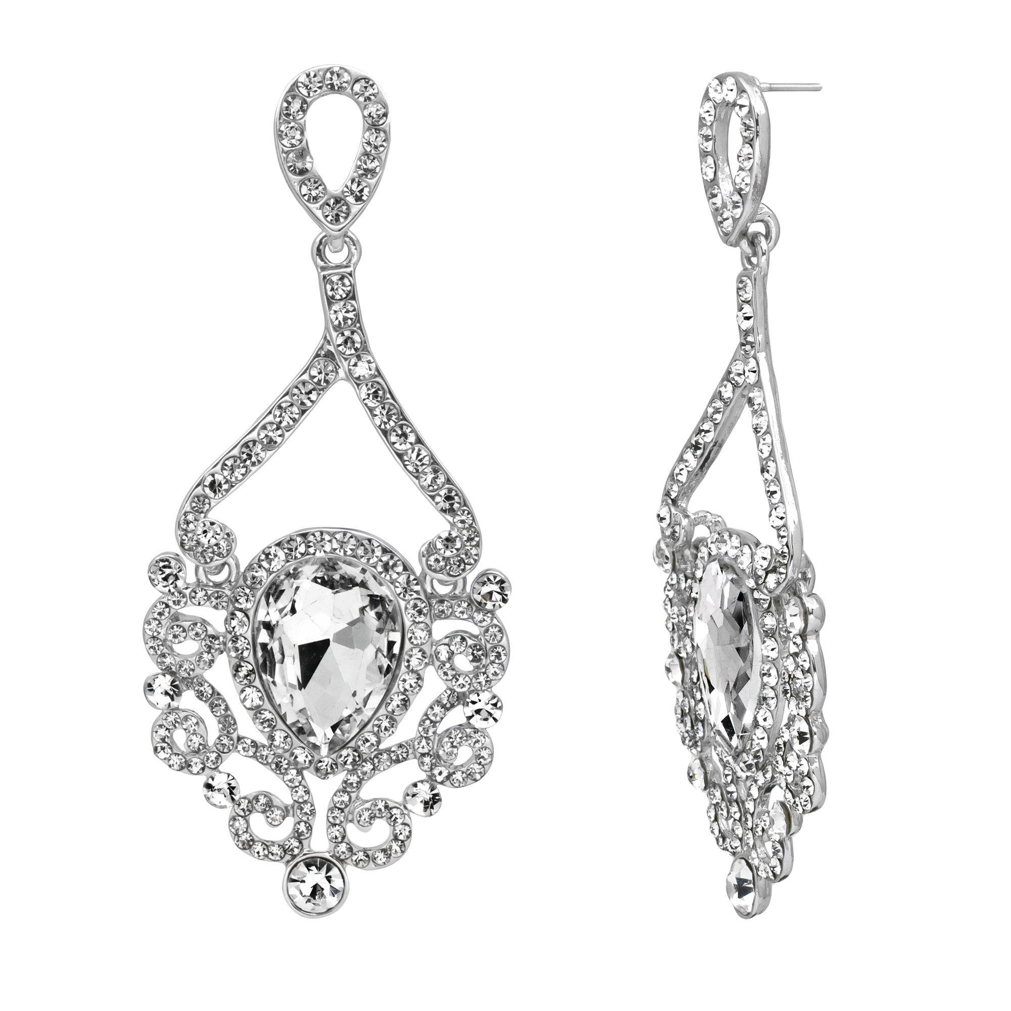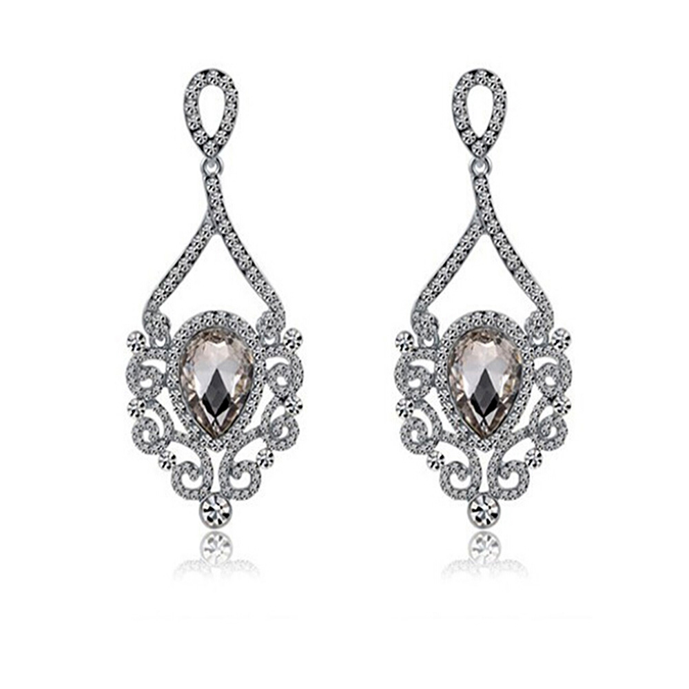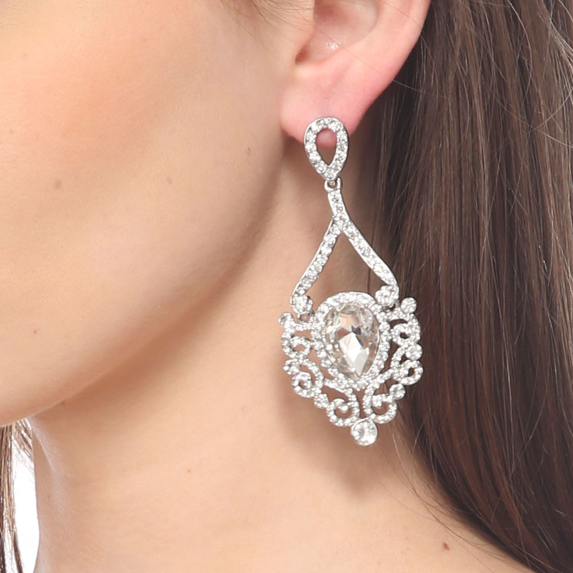 Hermosos aretes en baño de oro blanco de 18 quilates, fino diseño, con grecas, cristal blanco corte pera e incrustación de cristales blancos.