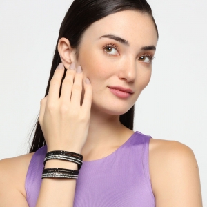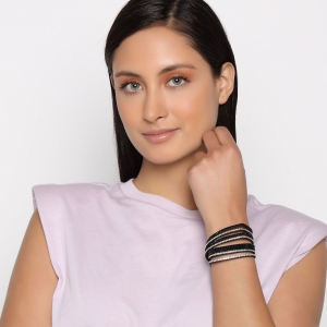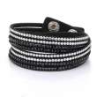 Pulsera de forro de piel en color negro con incrustación de cristales en color blanco y negro. Fabricado en una estructura de aleación de platino con rodio sin níquel 1. joyería Hipoalergénica. 2. Incluye cajita de joyería. 3. Garantía de 30 días por defectos de fabrica.