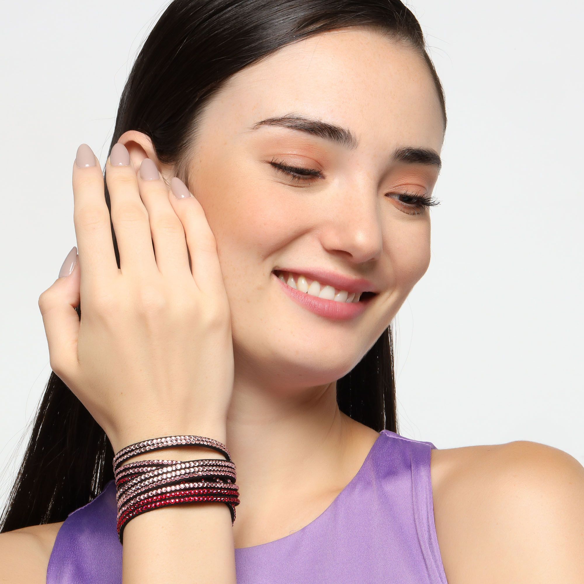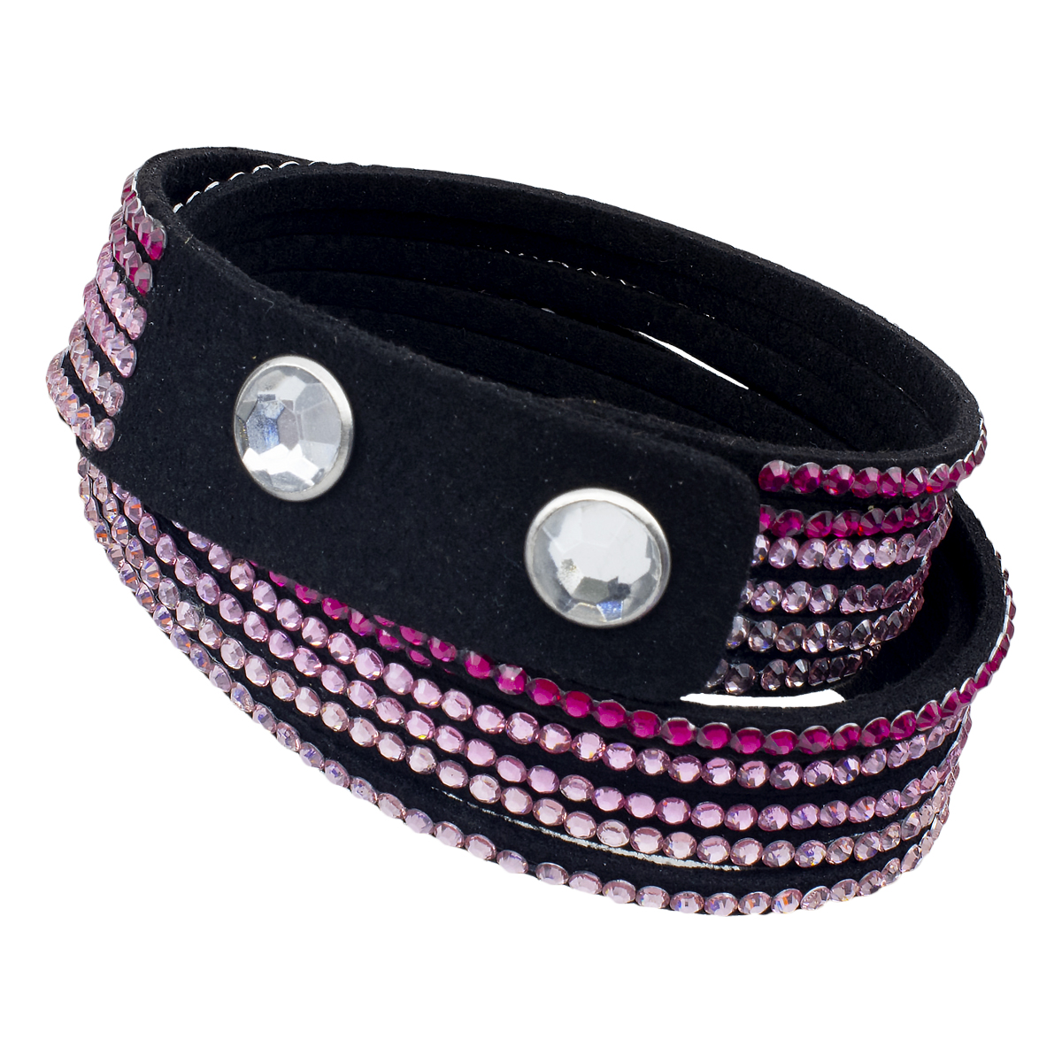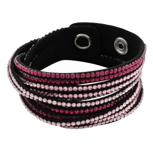 Original brazalete en gamuza color rosa, estilo muñequera, con tiras de cristales rosa y fucsia.