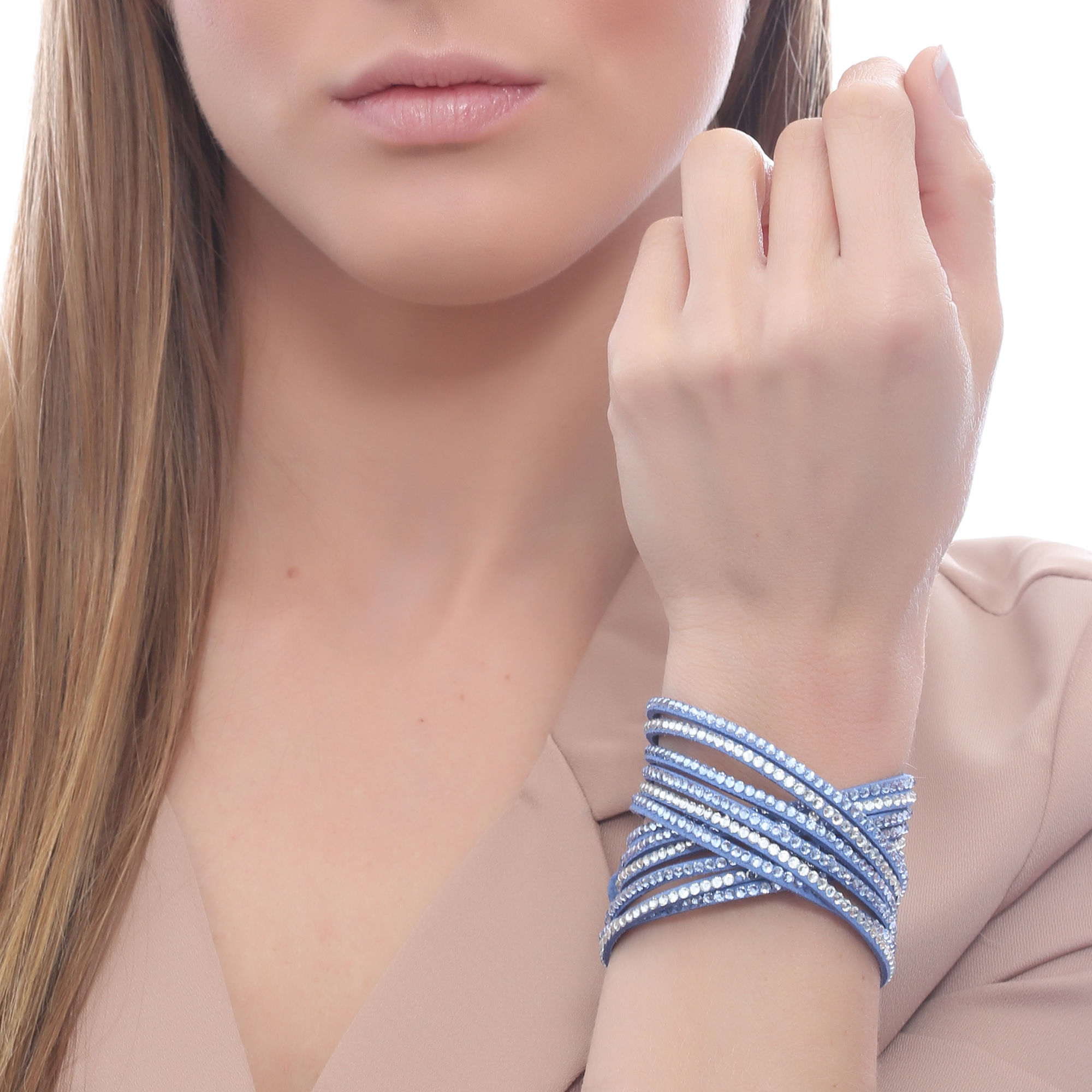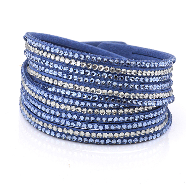 Lindo brazalete en gamuza color azul, estilo muñequera, con tiras de cristales azul y blanco.