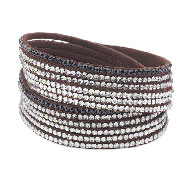 Lindo brazalete en gamuza color café chocolate, estilo muñequera, con tiras de cristales blanco y negro.