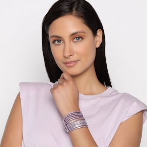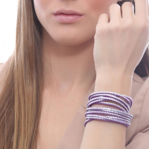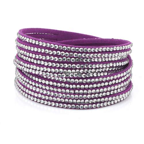 Bello brazalete en gamuza color morado, estilo muñequera, con tiras de cristales blancos.