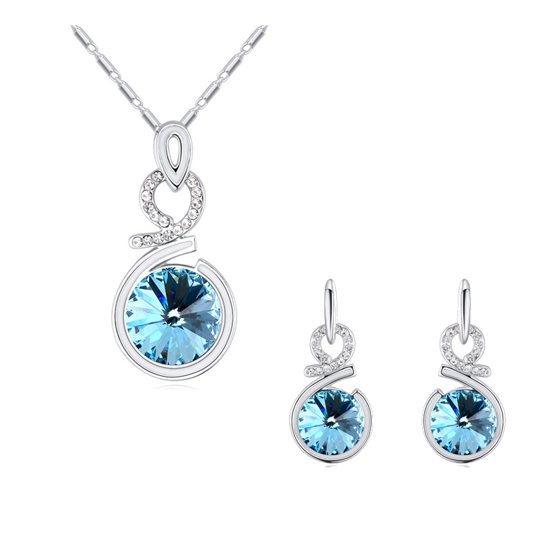 Hermoso set de aretes y dije con cadena en baño de oro blanco de 18 quilates, diseño de círculo con esmalte blanco y cristal azul corte brillante e incrustaciones de cristales blancos.