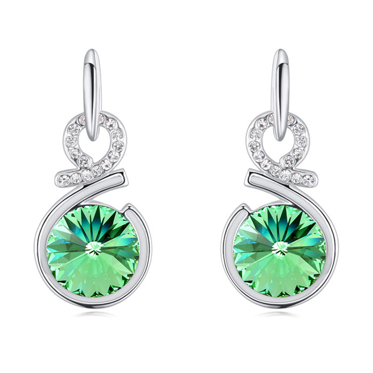Hermosos aretes en baño de oro blanco de 18 quilates, diseño de círculo, con cristal verde corte brillante e incrustaciones de cristales blancos.