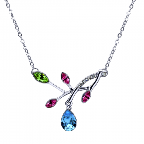 Dije en baño de oro blanco de 18 quilates, fino diseño de hojas con incrustación de cristales en color blanco y colores. Fabricado en una estructura de aleación de platino con rodio sin níquel 1. joyería Hipoalergénica. 2. Incluye cajita de joyería. 3. Garantía de 30 días por defectos de fabrica.