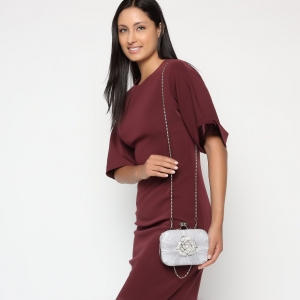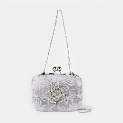 Bolsa de noche, en color blanco, con diseño rectangular, hermoso detalle central en forma de flor, con baño de oro blanco de 18 quilates e incrustaciones de cristales blancos.