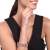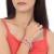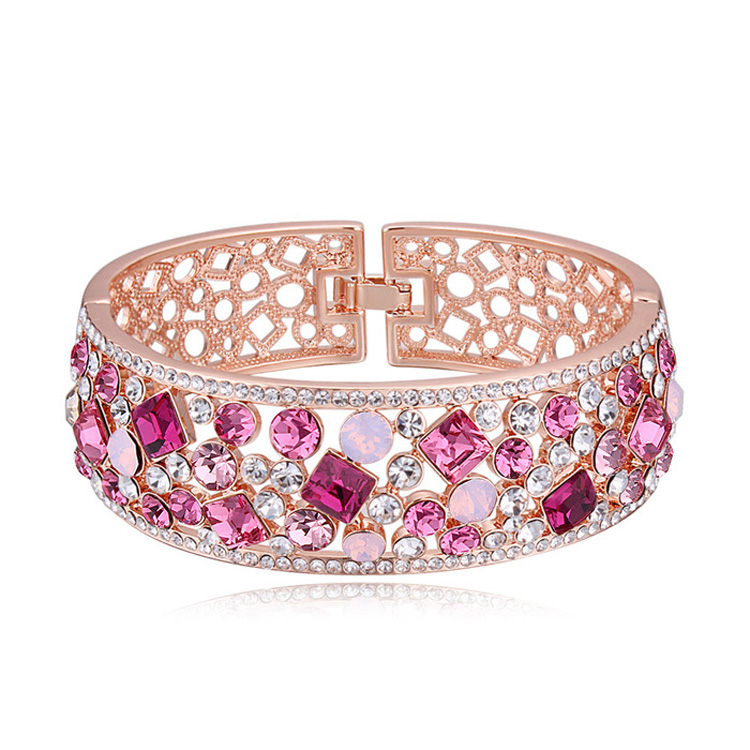 Brazalete en baño de oro rosa de 18 quilates, fino diseño geométrico, estilo calado, con incrustación de cristales en tonos rosas, ópalo y blanco.