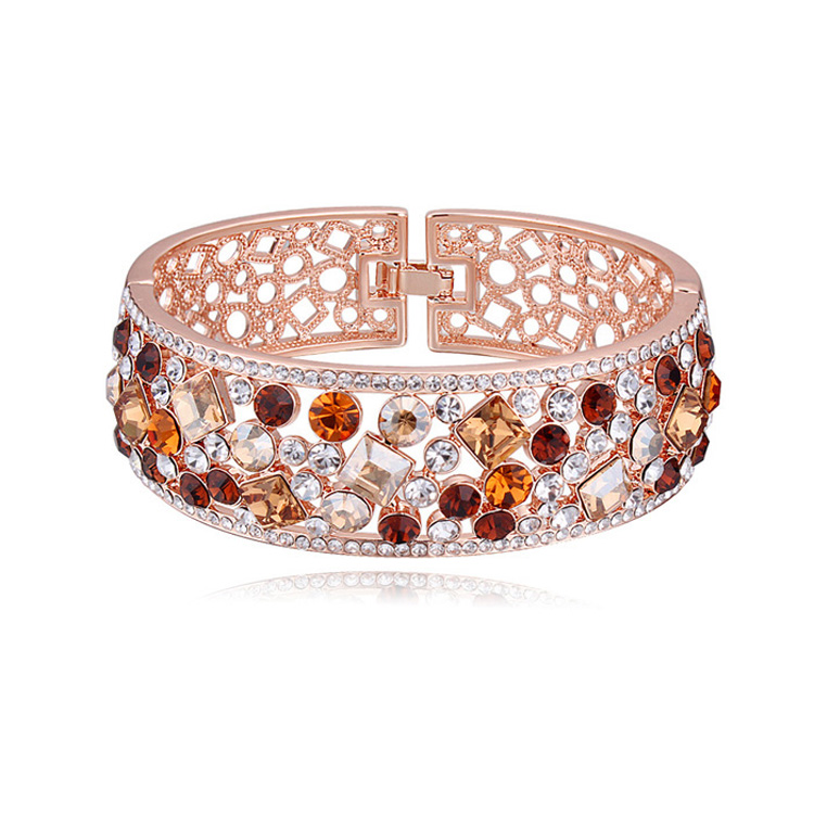 Brazalete en baño de oro rosa de 18 quilates, fino diseño geométrico, estilo calado, con incrustaciones de cristales en tonos ámbar y blanco.