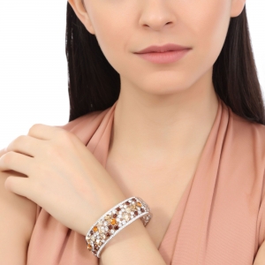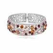Brazalete en baño de oro blanco de 18 quilates, fino diseño geométrico, estilo calado, con incrustaciones de cristales en tonos ámabar y blanco.