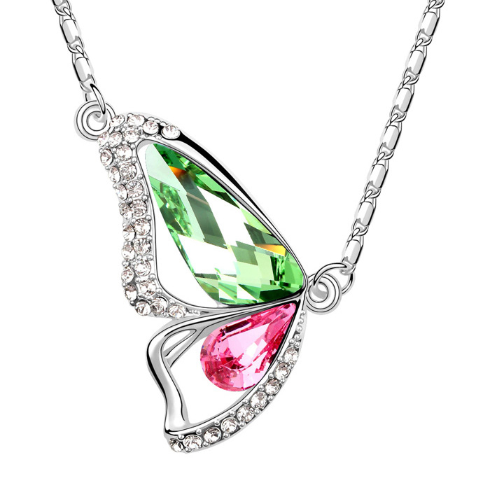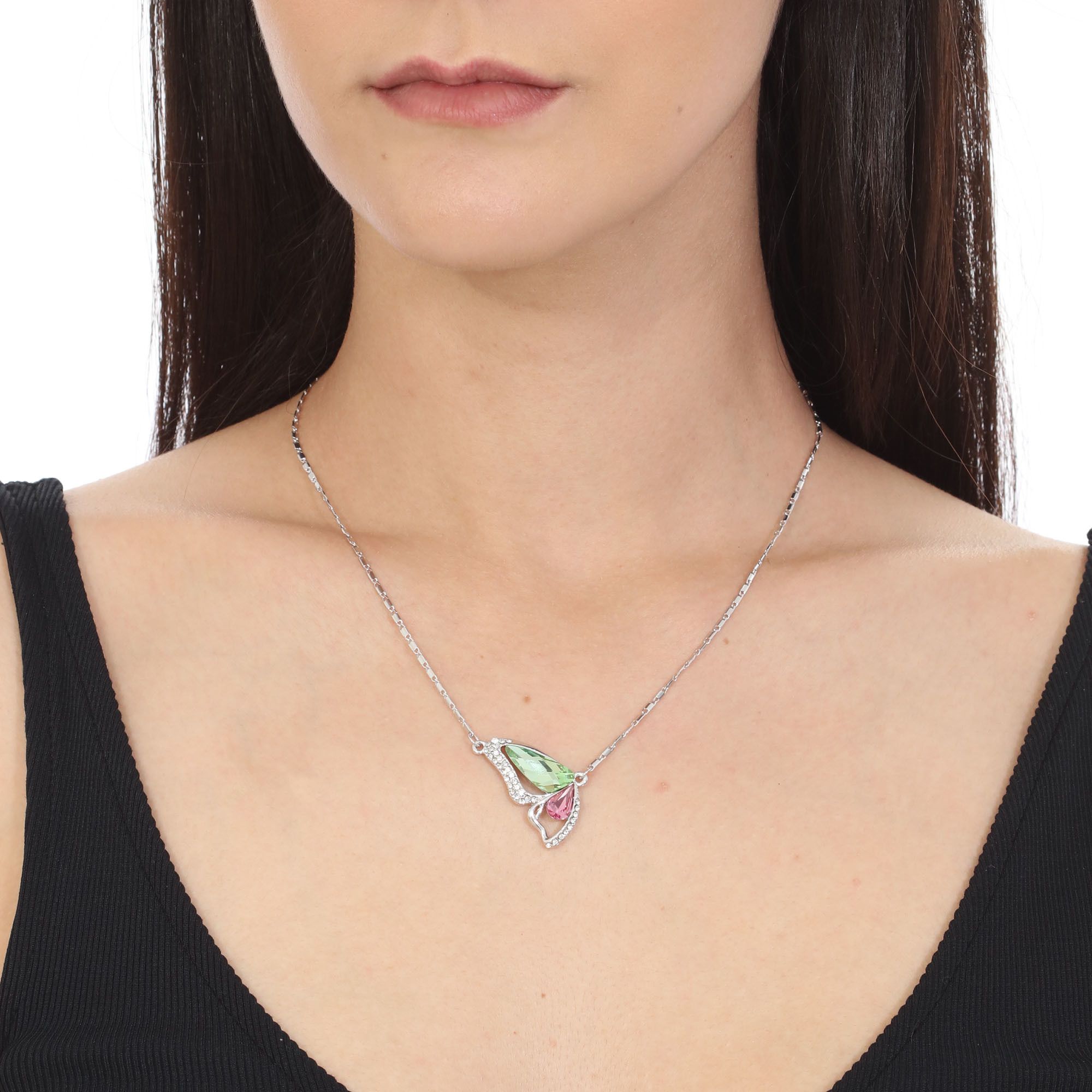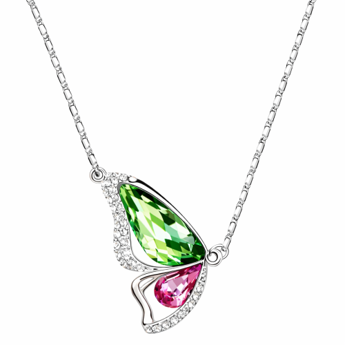 Delicado Collar en baño de oro blanco de 18 quilates, con diseño de mariposa con incrustación de cristales en color blanco, rosa y verde.