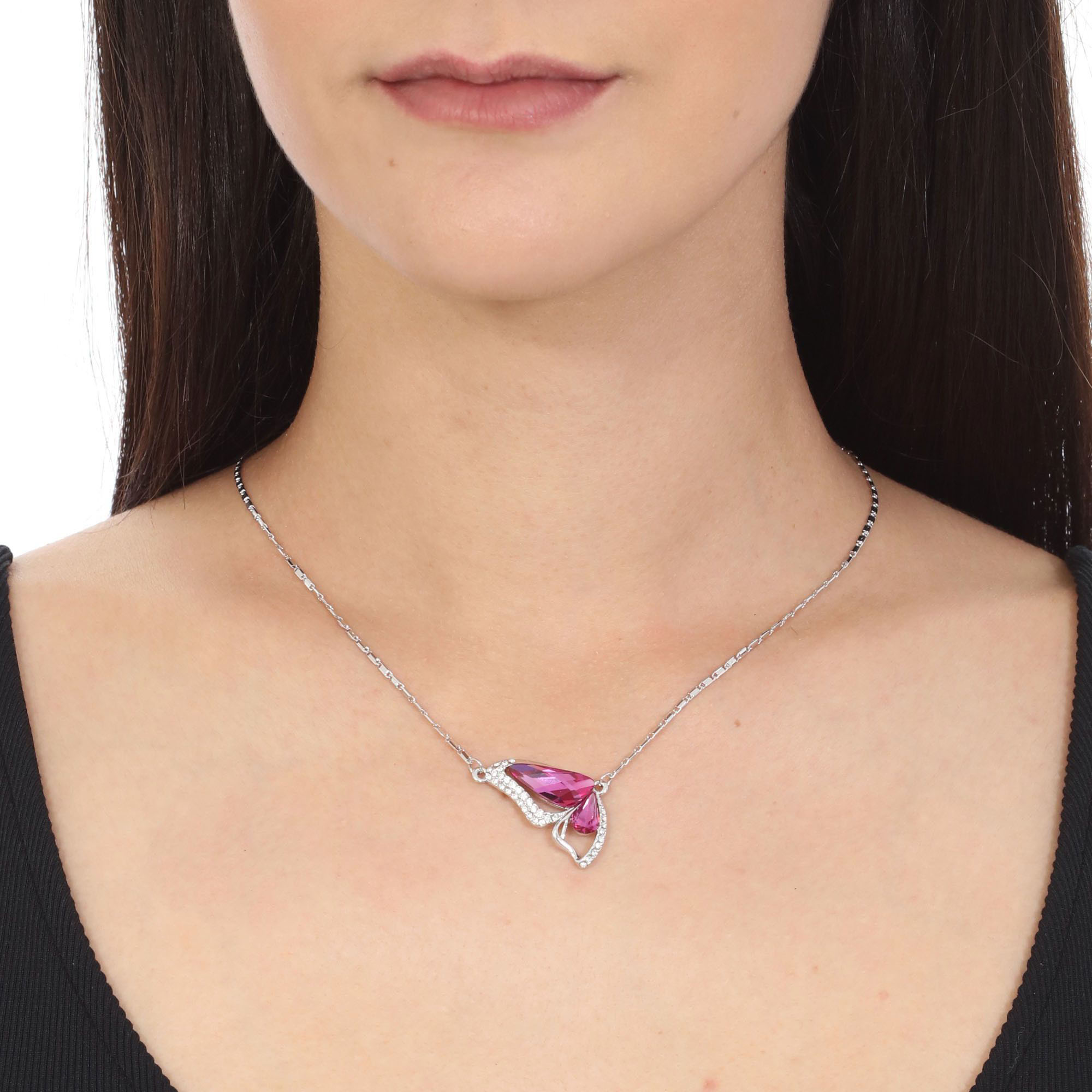 Hermoso Collar en baño de oro blanco de 18 quilates, diseño de mariposa con incrustación de cristales en color blanco y fiusha. Fabricado en una estructura de aleación de platino con rodio sin níquel 1. joyería Hipoalergénica. 2. Incluye cajita de joyería. 3. Garantía de 30 días por defectos de fabrica.