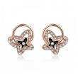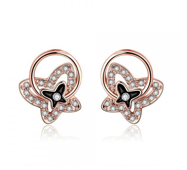 Aretes en baño de oro rosa de 18 quilates, diseño de mariposa, con esmaltado color negro e incrustación de cristales blancos. Fabricado en una estructura de aleación de platino con rodio sin níquel