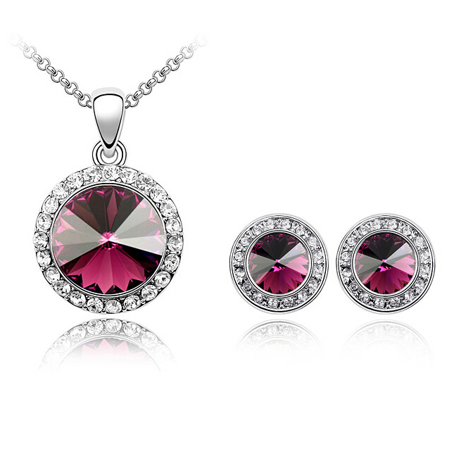 Juego de aretes y dije en baño de oro blanco de 18 quilates, diseño de círculo con incrustación de cristales en color purpura y blanco.