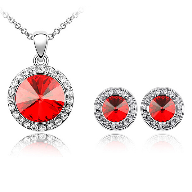 Juego de aretes y dije en baño de oro blanco de 18 quilates, diseño de círculo con incrustación de cristales en color rojo y blanco.