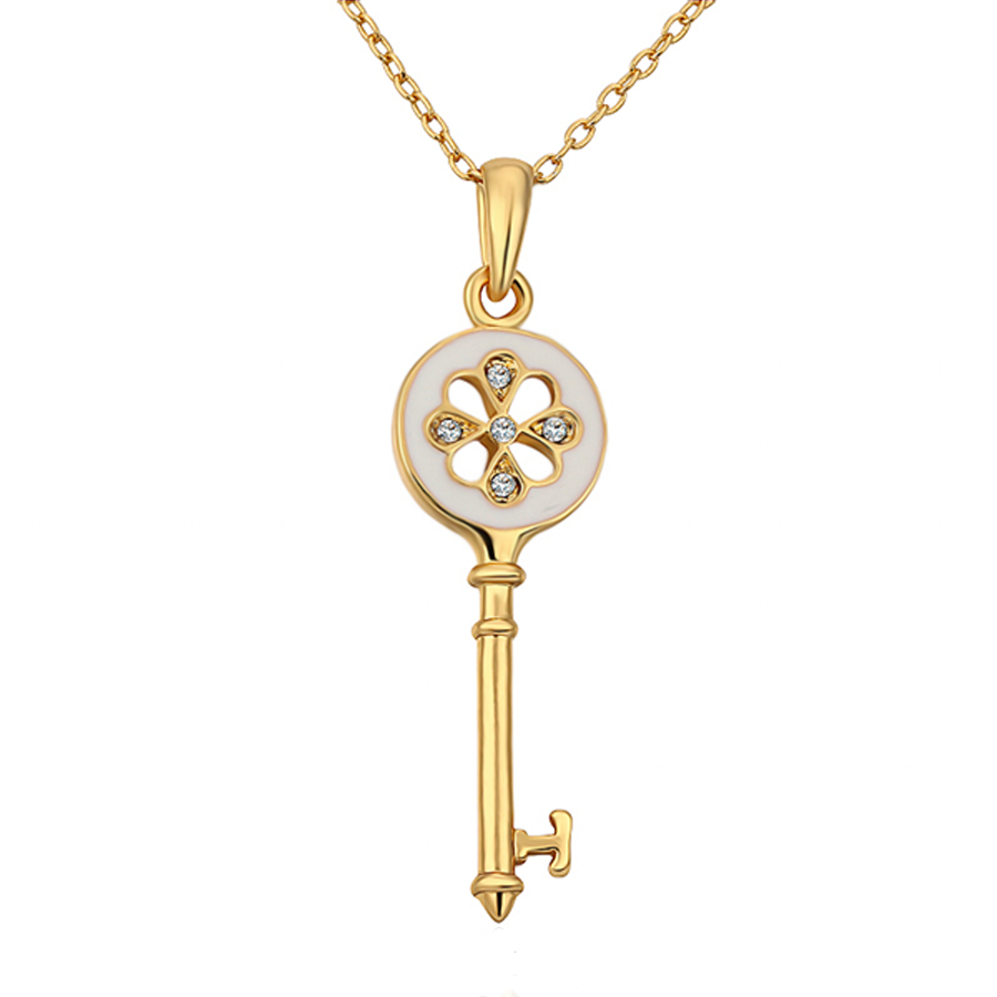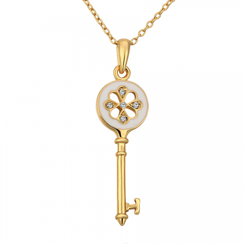 Dije en ba�o de oro amarillo de 18 quilates, dise�o de llave con esmaltado blanco e incrustaci�n de cristales en color blanco.