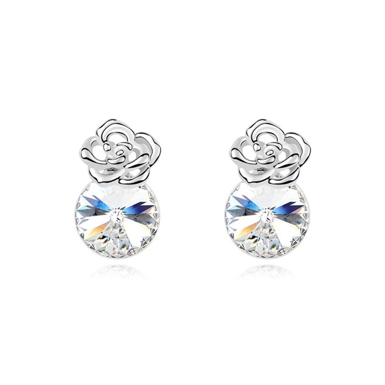 Hermosos aretes en baño de oro blanco de 18 quilates, sofisticado diseño de flor, con cristal blanco corte brillante. Fabricado en una estructura de aleación de platino con rodio sin níquel