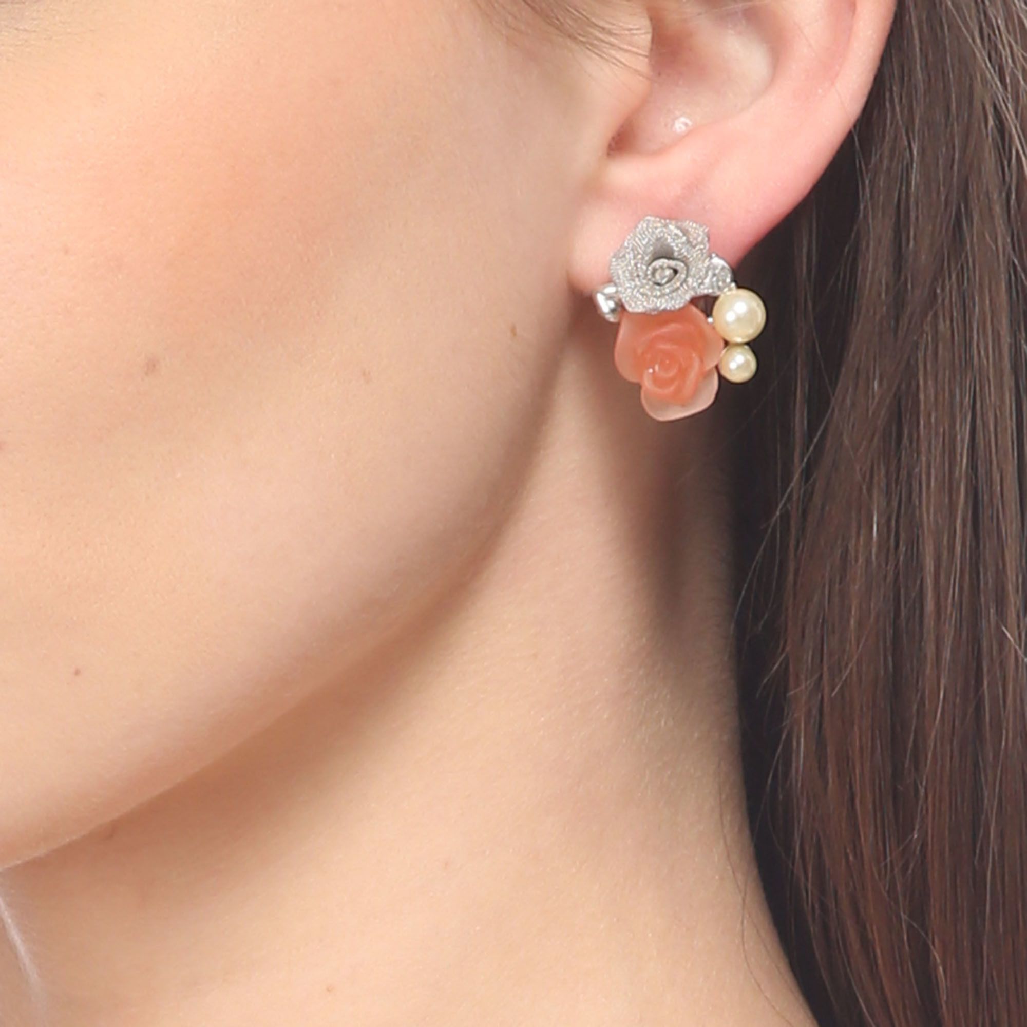 Hermosos aretes en baño de oro blanco de 18 quilates, diseño de rosas en malla y cristal opaco color durazno, perla blanca e incrustación de cristales blancos.