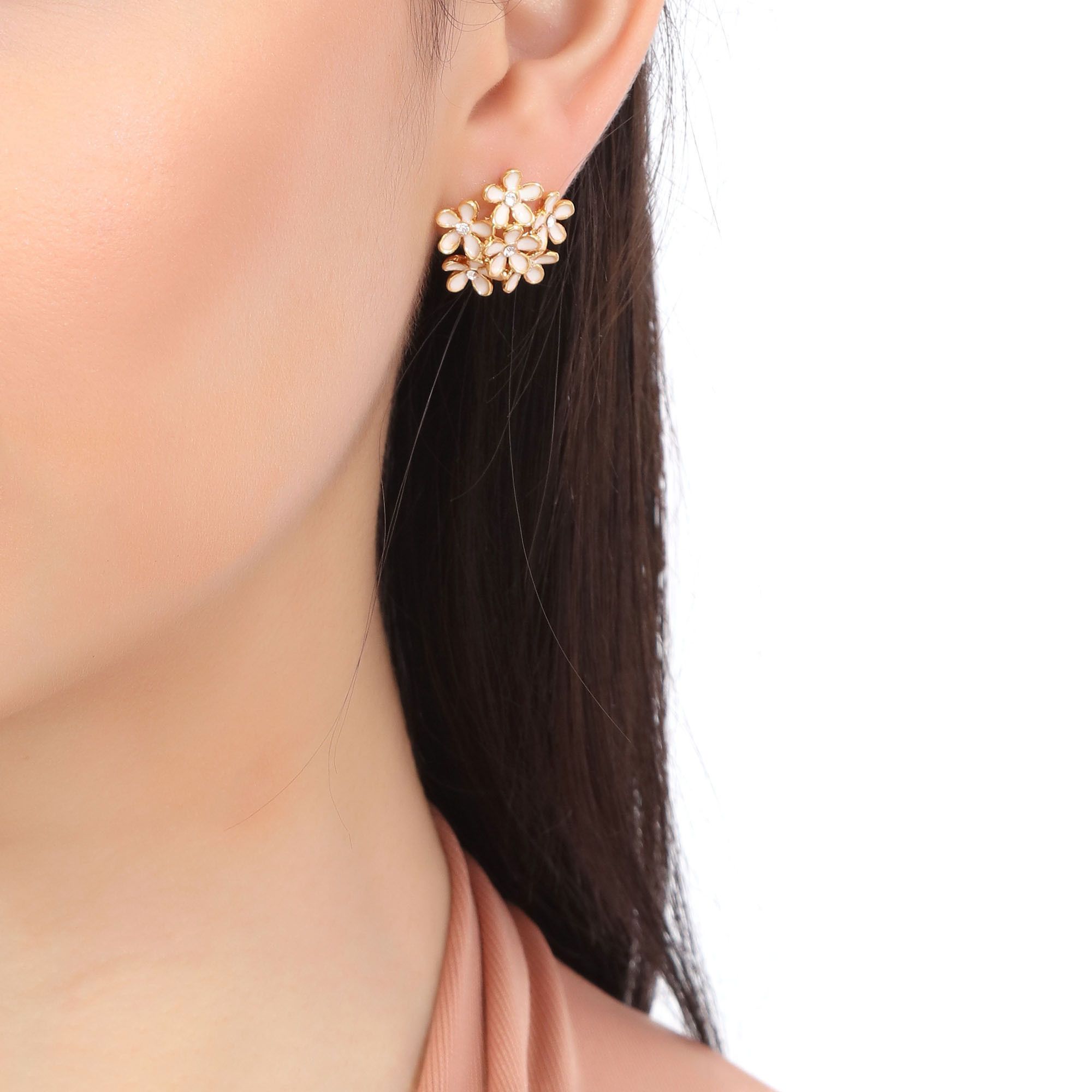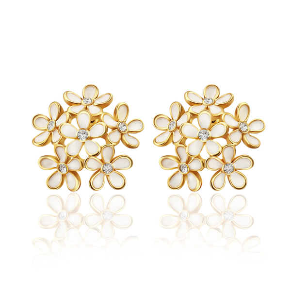 Aretes en baño de oro amarillo de 18 quilates, diseño de flores, con esmaltado blanco e incrustación de cristales en color blanco. Fabricado en una estructura de aleación de platino con rodio sin níquel