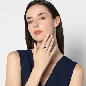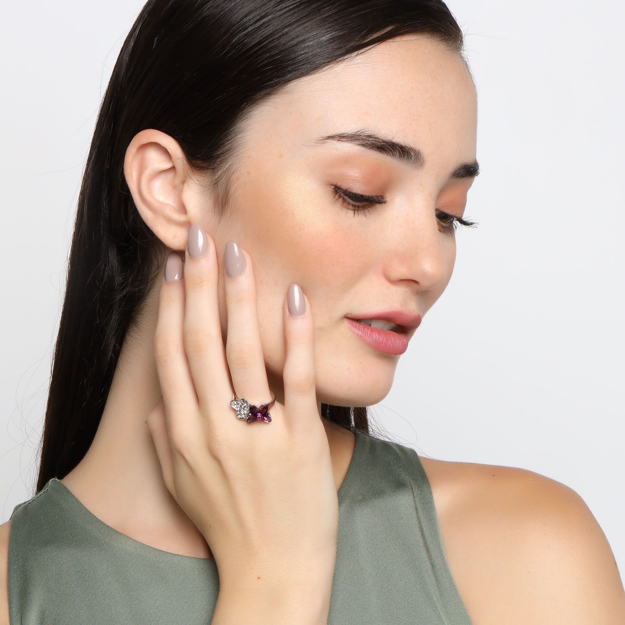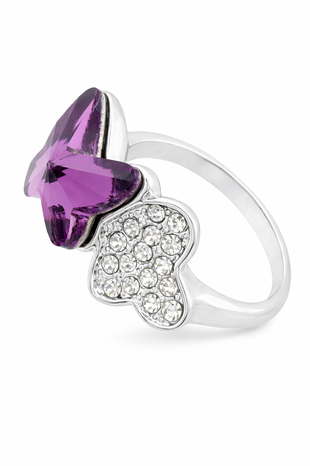 Delicado anillo, en baño de oro blanco de 18 quilates, diseño de mariposas, con mariposa de cristal color púrpura e incrustaciones de cristales blancos.