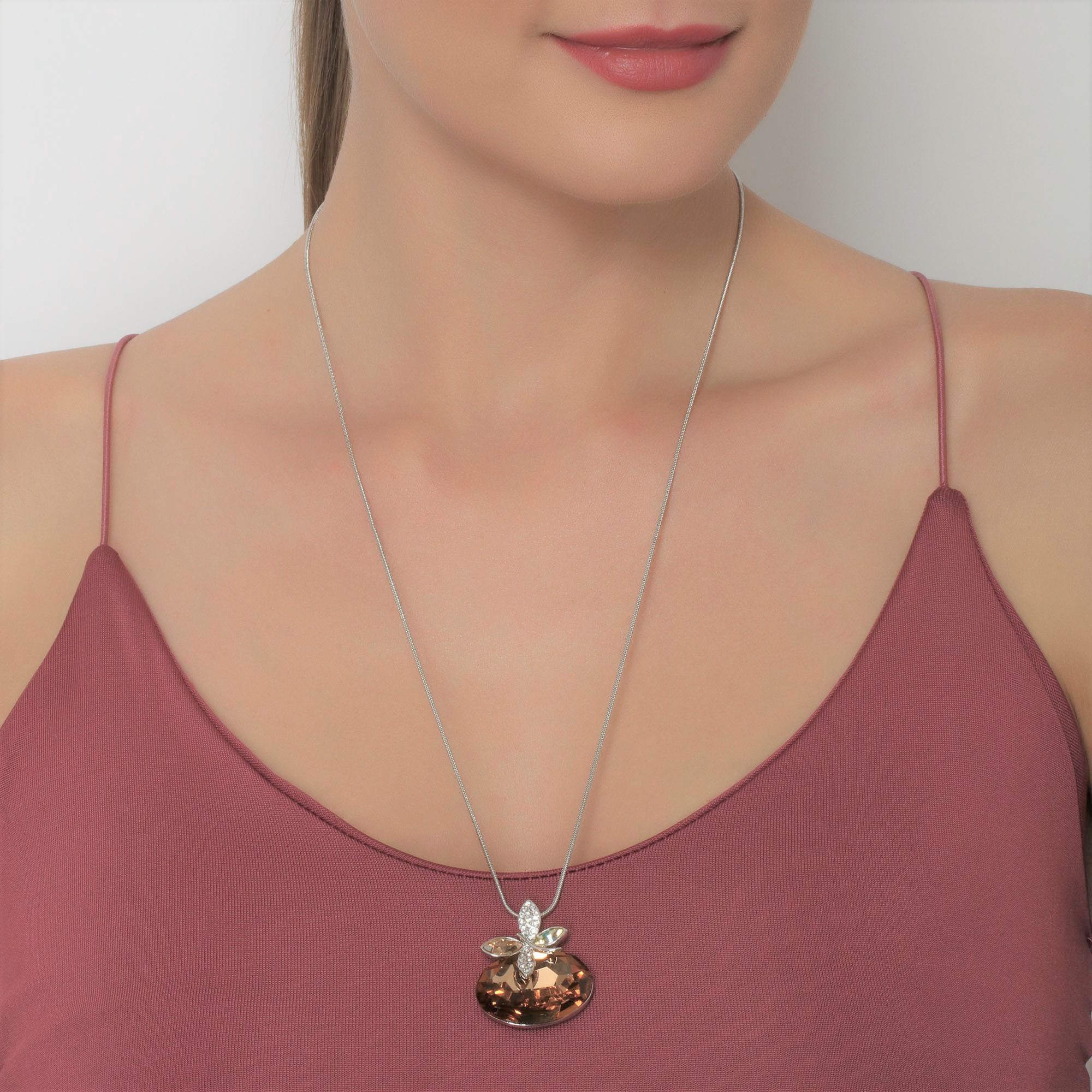 Collar en baño de oro blanco de 18 quilates, diseño de mariposa con cristal ámbar corte oval, cristal tornasol e incrustaciones de cristales blancos.