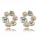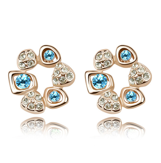 Elegantes aretes en baño de oro rosa de 18 quilates, diseño de corona, con incrustación de cristales en azul y blanco. Fabricado en una estructura de aleación de platino con rodio sin níquel
