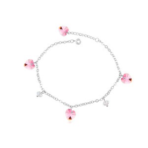 Pulsera en baño de oro blanco de 18 quilates, lindo diseño, con dijes de corazones en cristal rosa y cristales tornasol.