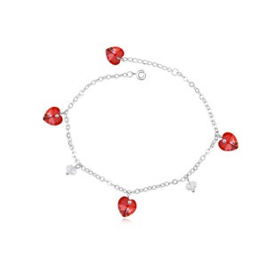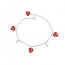 Pulsera en baño de oro blanco de 18 quilates, lindo diseño, con dijes en forma de corazón en cristal rojo y cristales tornasol.