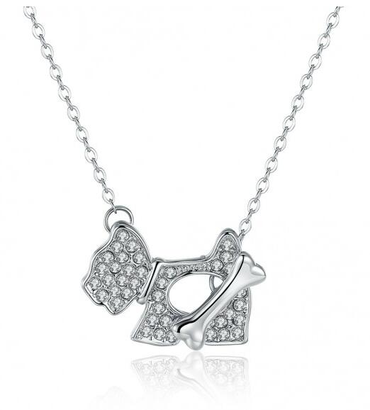 Tierno Dije en baño de oro blanco de 18 quilates, diseño de perrito con incrustación de cristales en color blanco. Fabricado en una estructura de aleación de platino con rodio sin níquel 1. joyería Hipoalergénica. 2. Incluye cajita de joyería. 3. Garantía de 30 días por defectos de fabrica.
