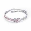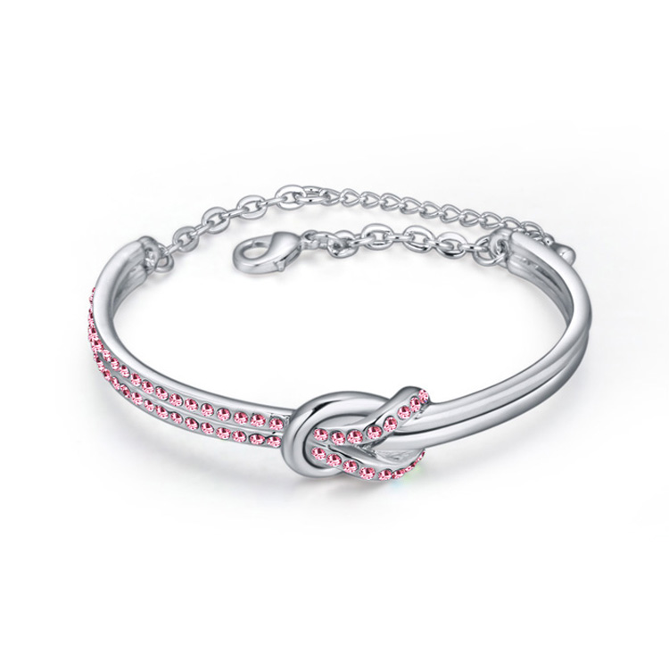 Lindo brazalete, en baño de oro blanco de 18 quilates, diseño de nudo, con incrustaciones de cristales en color rosa.