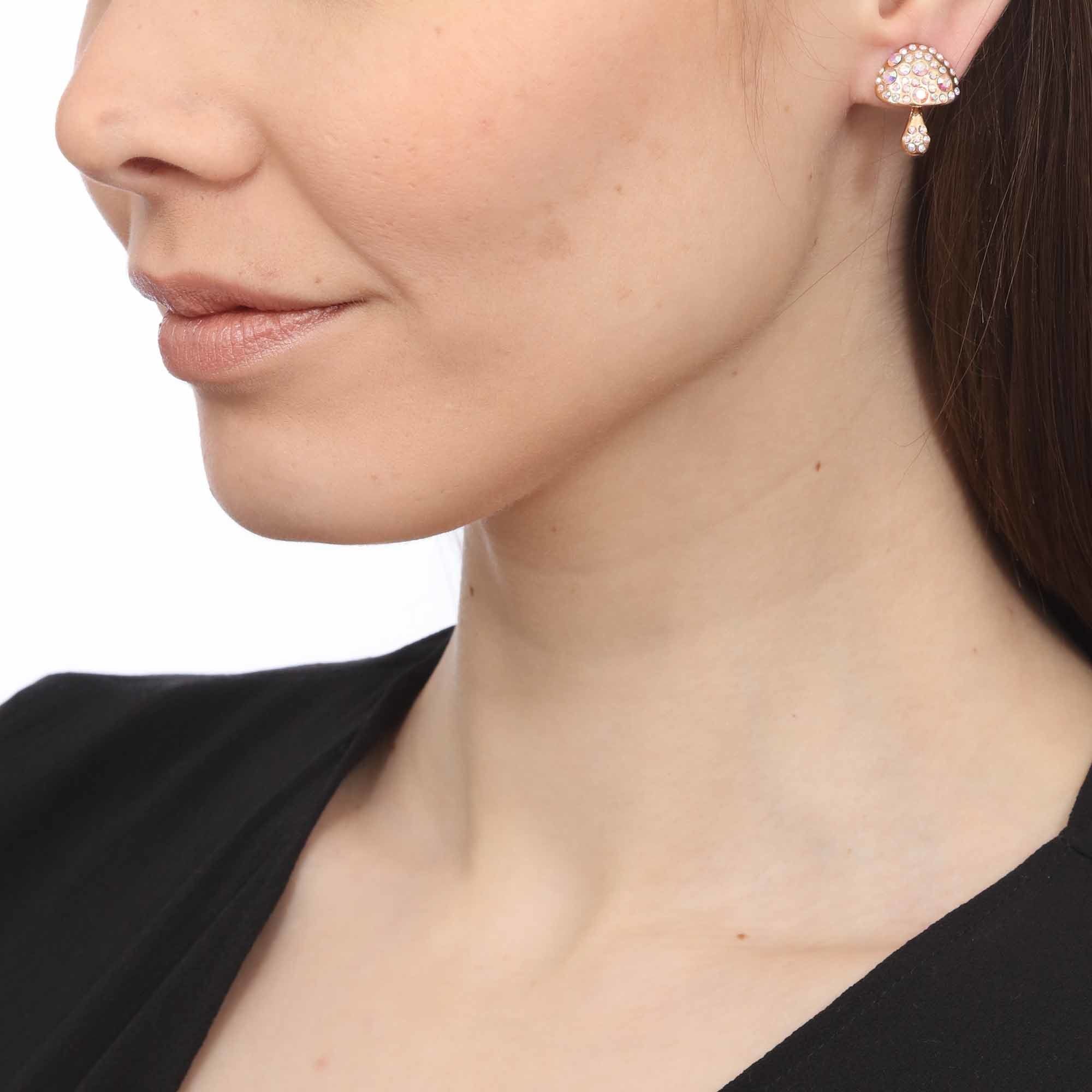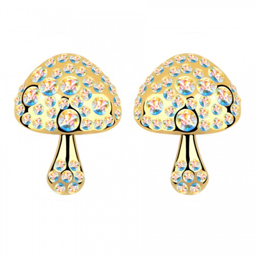 Lindos aretes en baño de oro amarillo de 18 quilates, diseño de hongo con incrustación de cristales en color blanco.