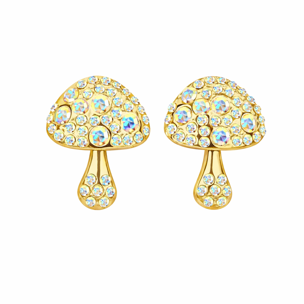 Lindos aretes en baño de oro amarillo de 18 quilates, diseño de hongo con incrustación de cristales en color tornasol.