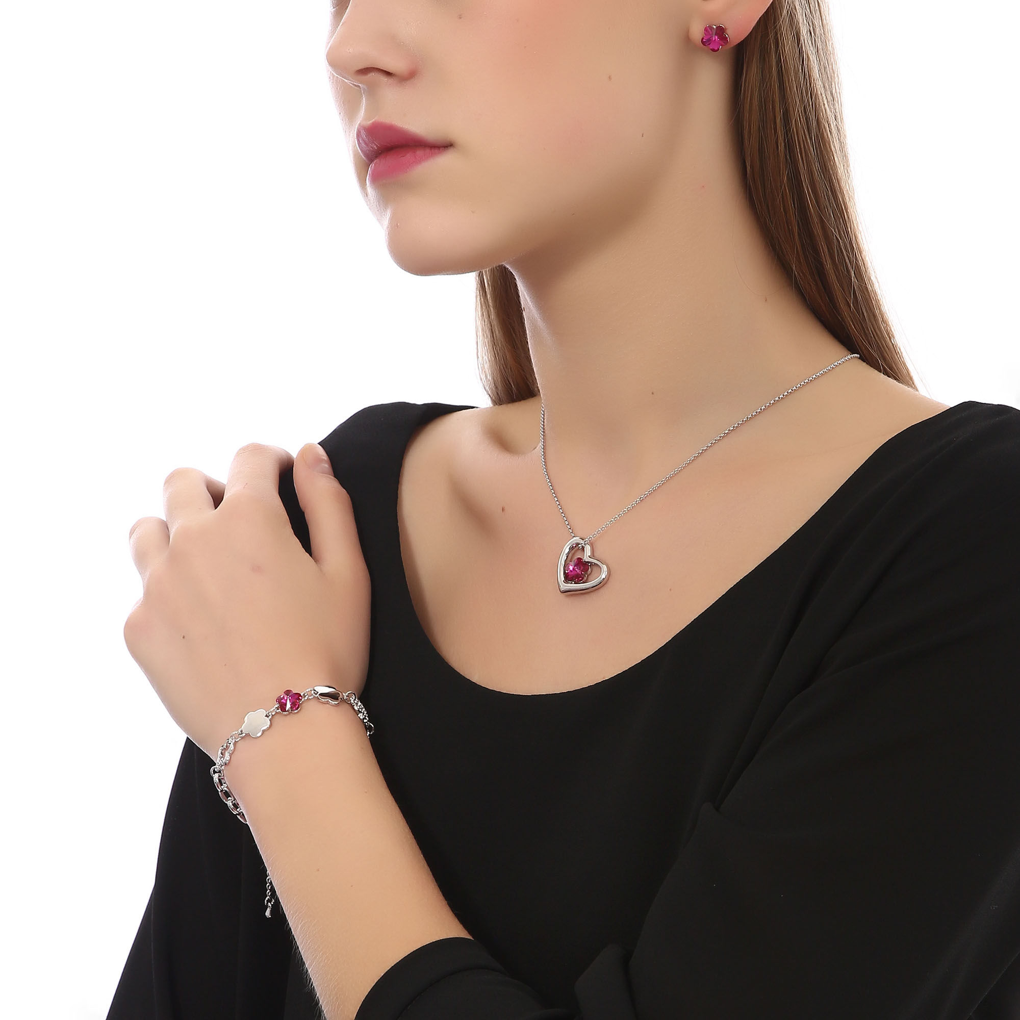 Juego de aretes, pulsera y dije en baño de oro blanco de 18 quilates, diseño de corazón con flores. incrustación de cristales en color rosa. cadena de 40 cm, con extención de 5 cm.