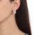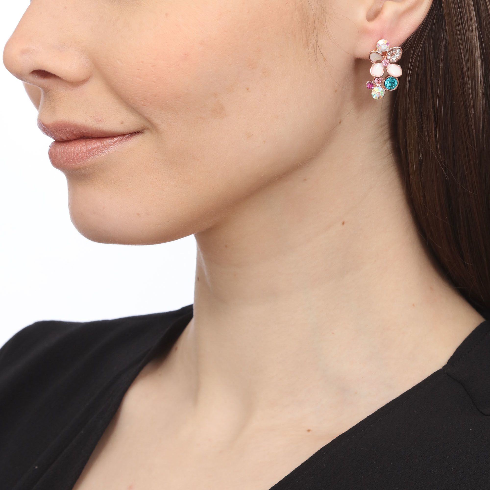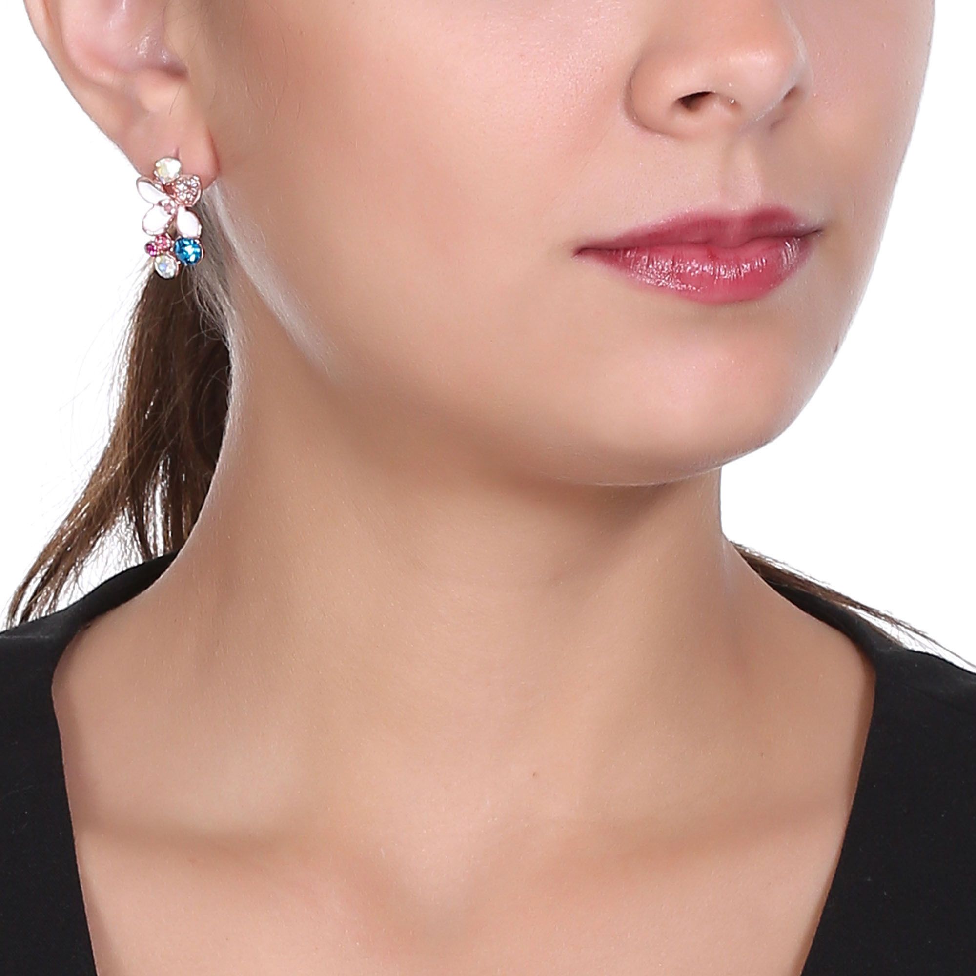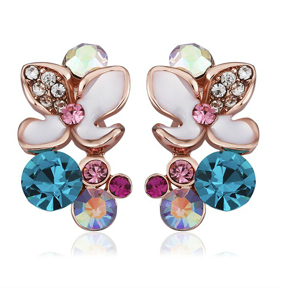 Hermosos aretes en baño de oro rosa de 18 quilates, diseño de flor, con detalle de esmaltado blanco e incrustación de cristales en colores azul, fuscia, rosa, tornasol y blanco.