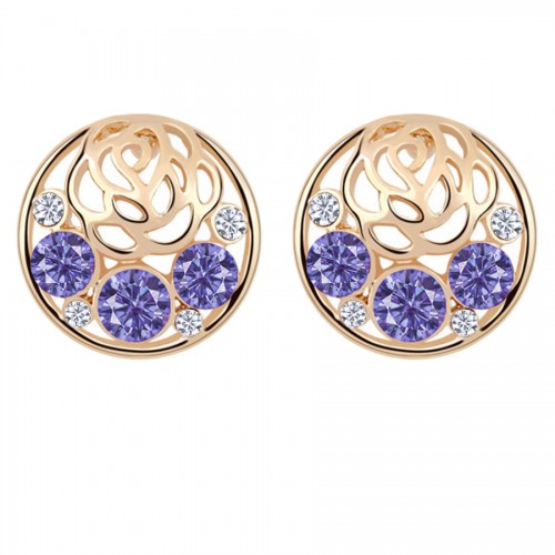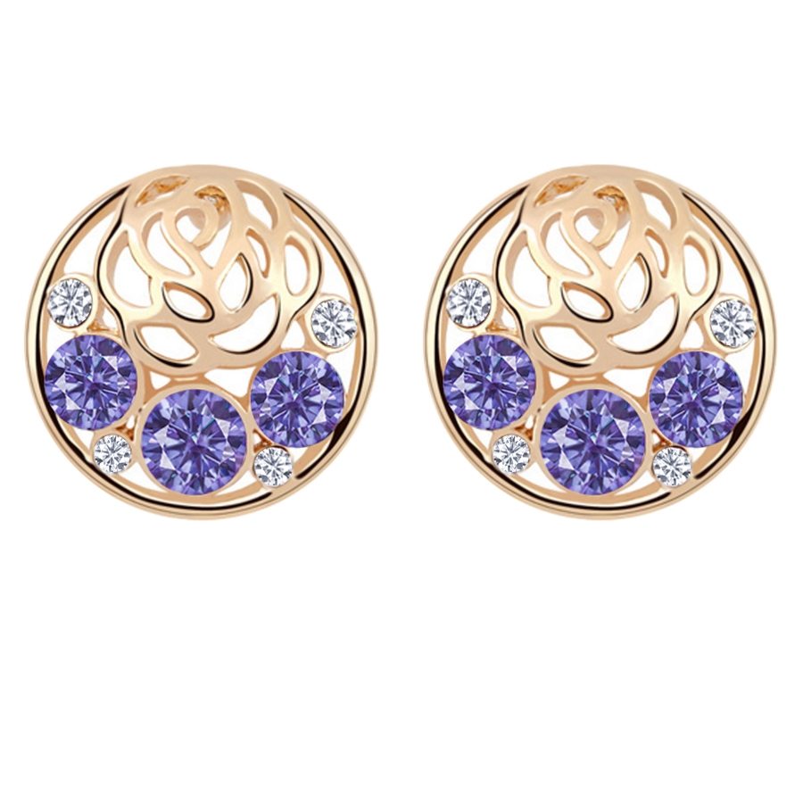 Preciosos aretes en baño de oro amarillo de 18 quilates, diseño de rosa grabada, con incrustación de cristales en color blanco y morado. Fabricado en una estructura de aleación de platino con rodio sin níquel