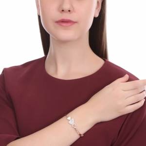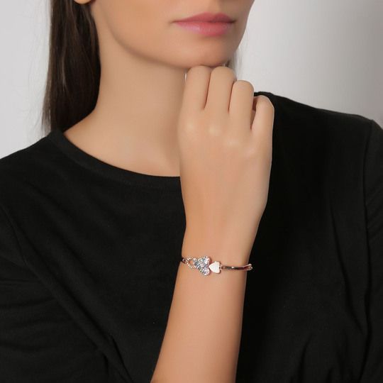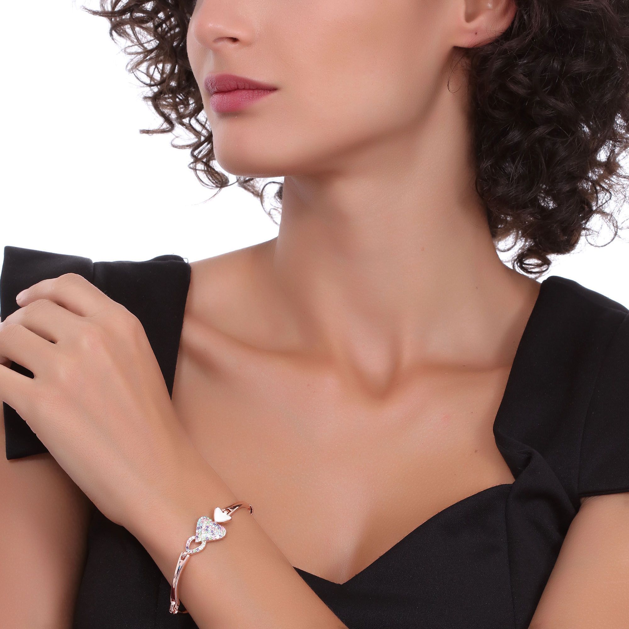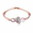 Brazalete en baño de oro rosa de 18 quilates, diseño de corazones, con esmaltado color blanco e incrustaciones de cristales multicolores.