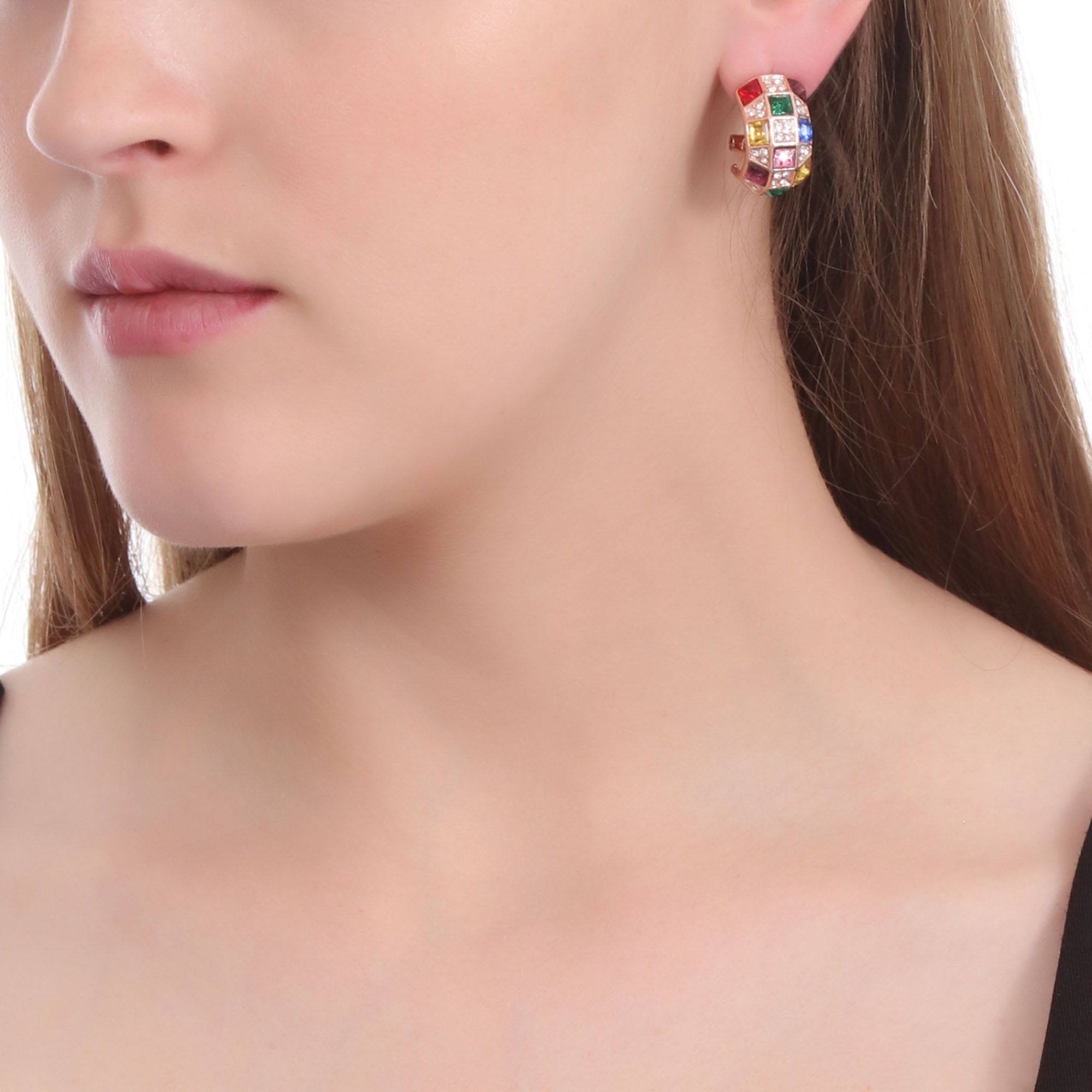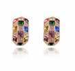 Elegantes aretes en baño de oro amarillo de 18 quilates, diseño geométrico, con incrustación de cristales en colores. Fabricado en una estructura de aleación de platino con rodio sin níquel