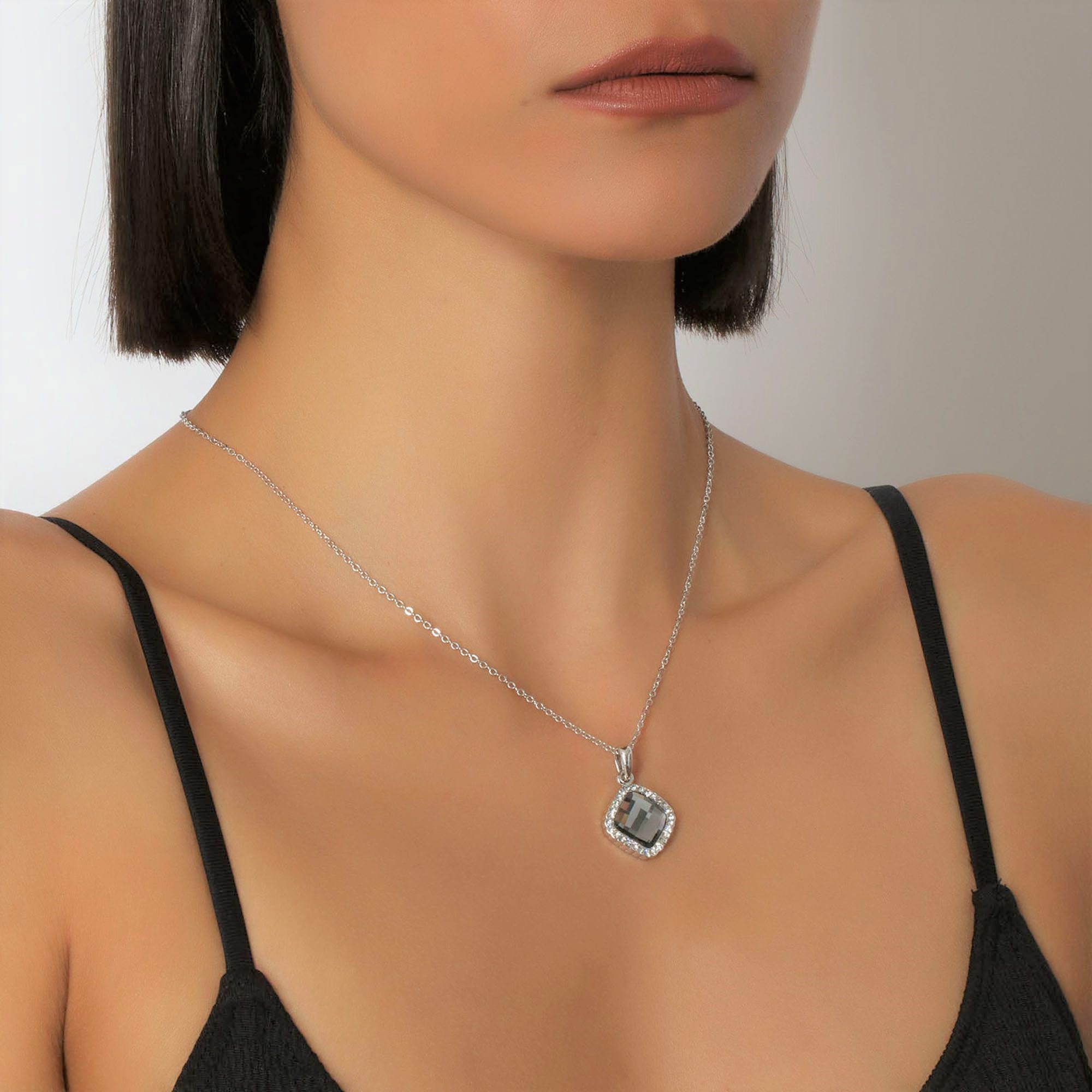 Delicado Dije con cadena en baño de oro blanco de 18 quilates, fino diseño con incrustación de cristales en color blanco y color humo. Fabricado en una estructura de aleación de platino con rodio sin níquel. 1. joyería Hipoalergénica. 2. Incluye cajita de joyería. 3. Garantía de 30 días por defectos de fabrica.