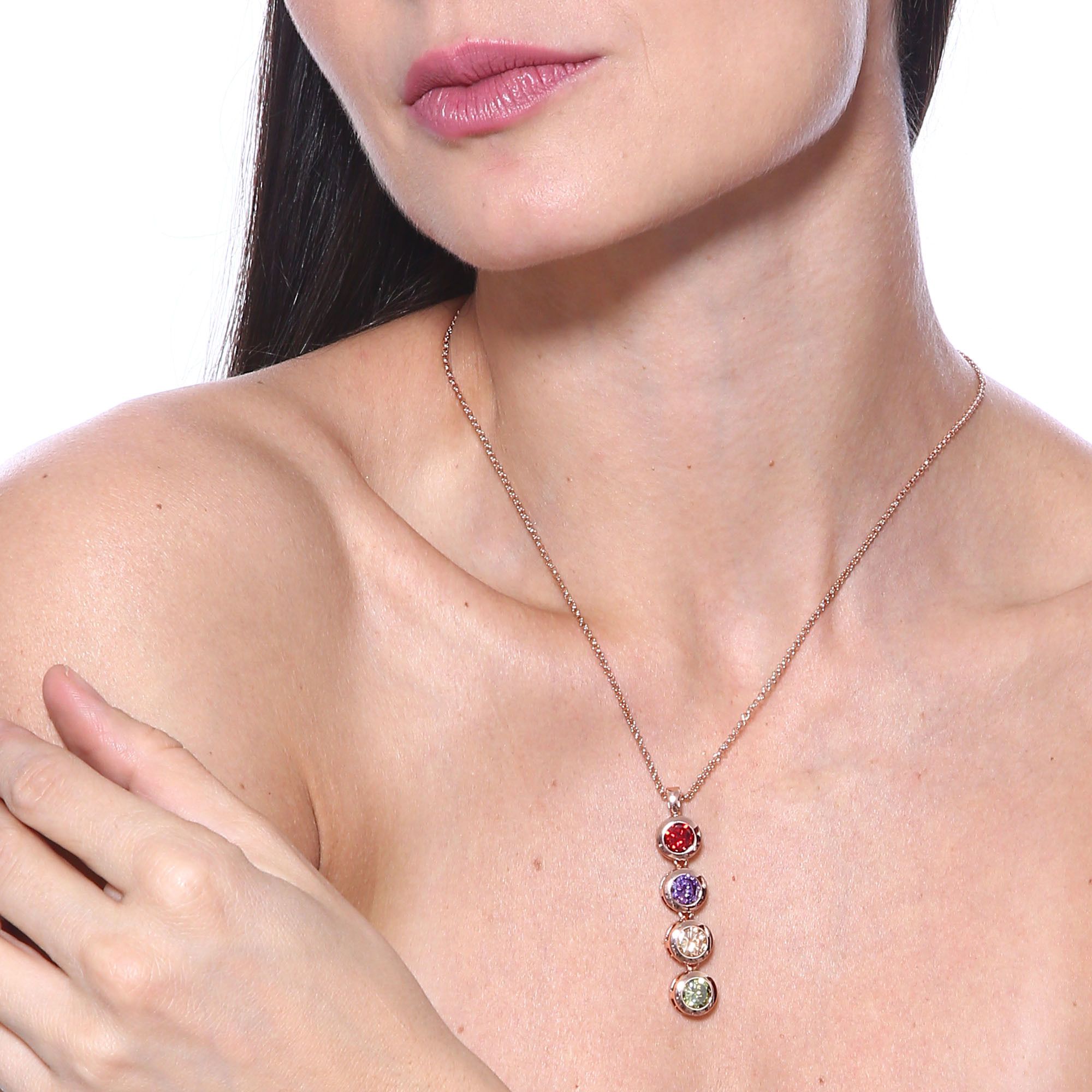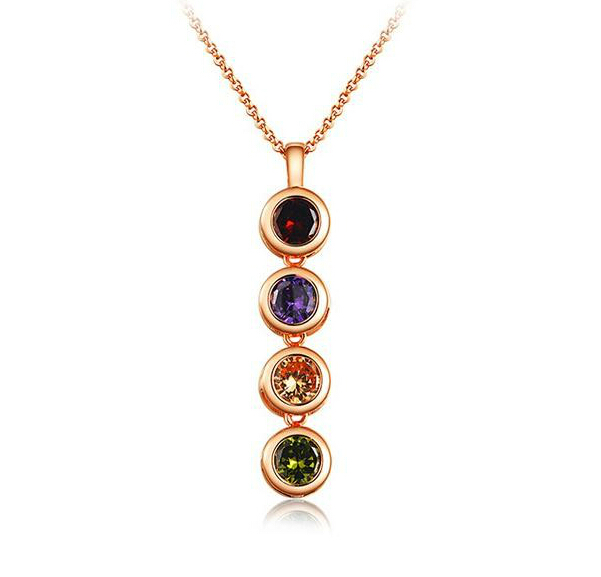 ExquisitoDije en baño de oro rosa de 18 quilates, diseño con incrustación de cristales en colores morado, rojo, verde y amarillo. Fabricado en una estructura de aleación de platino con rodio sin níquel 1. joyería Hipoalergénica. 2. Incluye cajita de joyería. 3. Garantía de 30 días por defectos de fabrica.