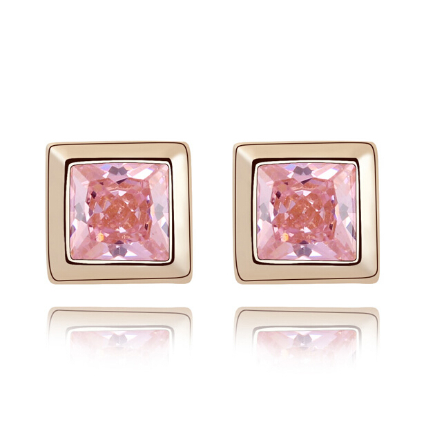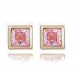 Lindos aretes en baño de oro amarillo de 18 quilates, diseño de cuadro, con incrustación de cristal en color rosa corte cushion. Fabricado en una estructura de aleación de platino con rodio sin níquel