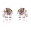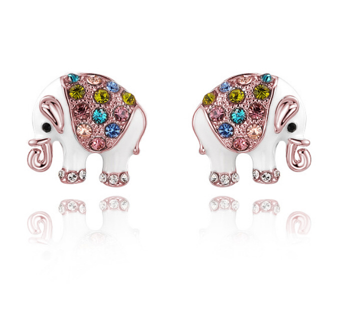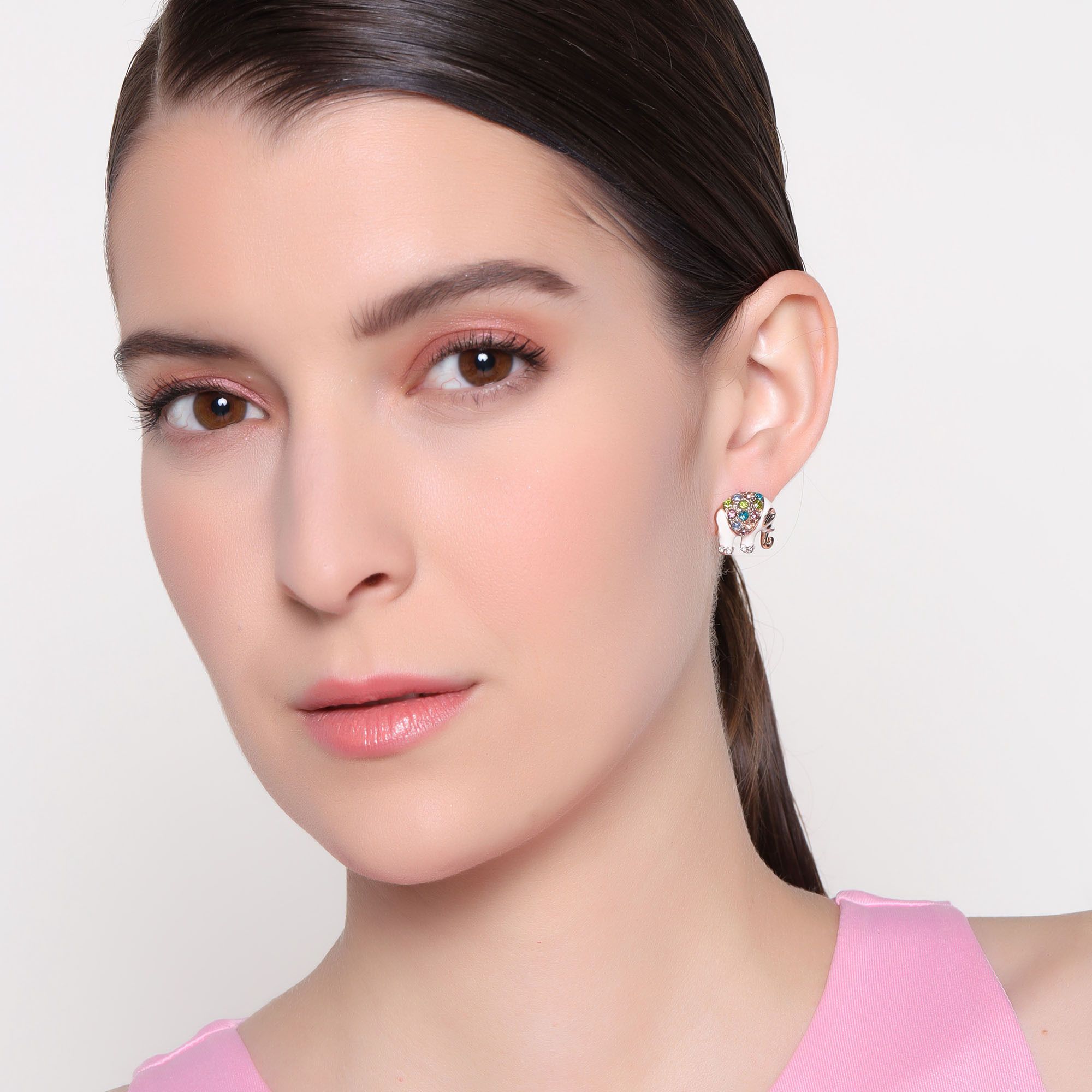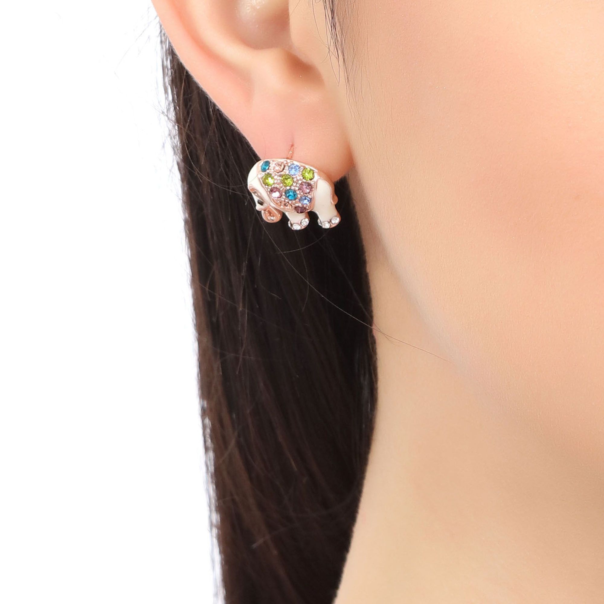 Hermosos aretes en baño de oro rosa de 18 quilates, diseño de elefante, con detalles en relieve, esmaltado blanco e incrustación de cristales en colores. Fabricado en una estructura de aleación de platino con rodio sin níquel